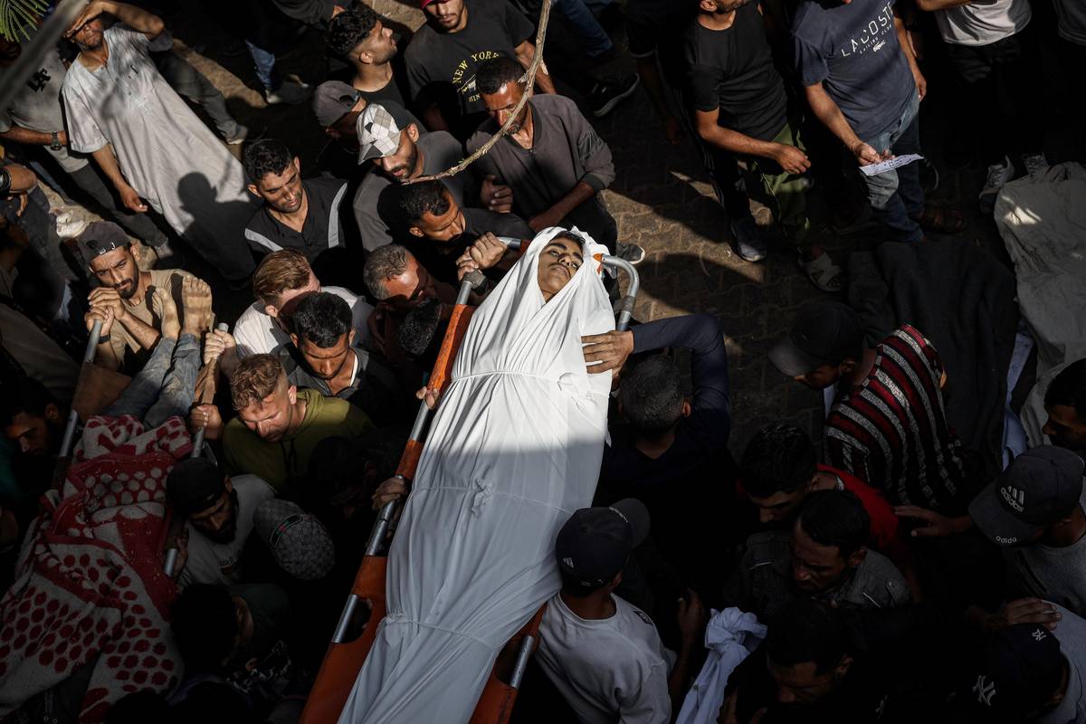 (Hromadný pohřeb Palestinců zabitých během izraelských náletů na různé oblasti v Pásmu Gazy, který se konal v nemocnici al-Šífa. Mezi oběťmi byly osoby, které čekaly na humanitární pomoc v centrální oblasti Netzarim, vyfoceno 1. července.)