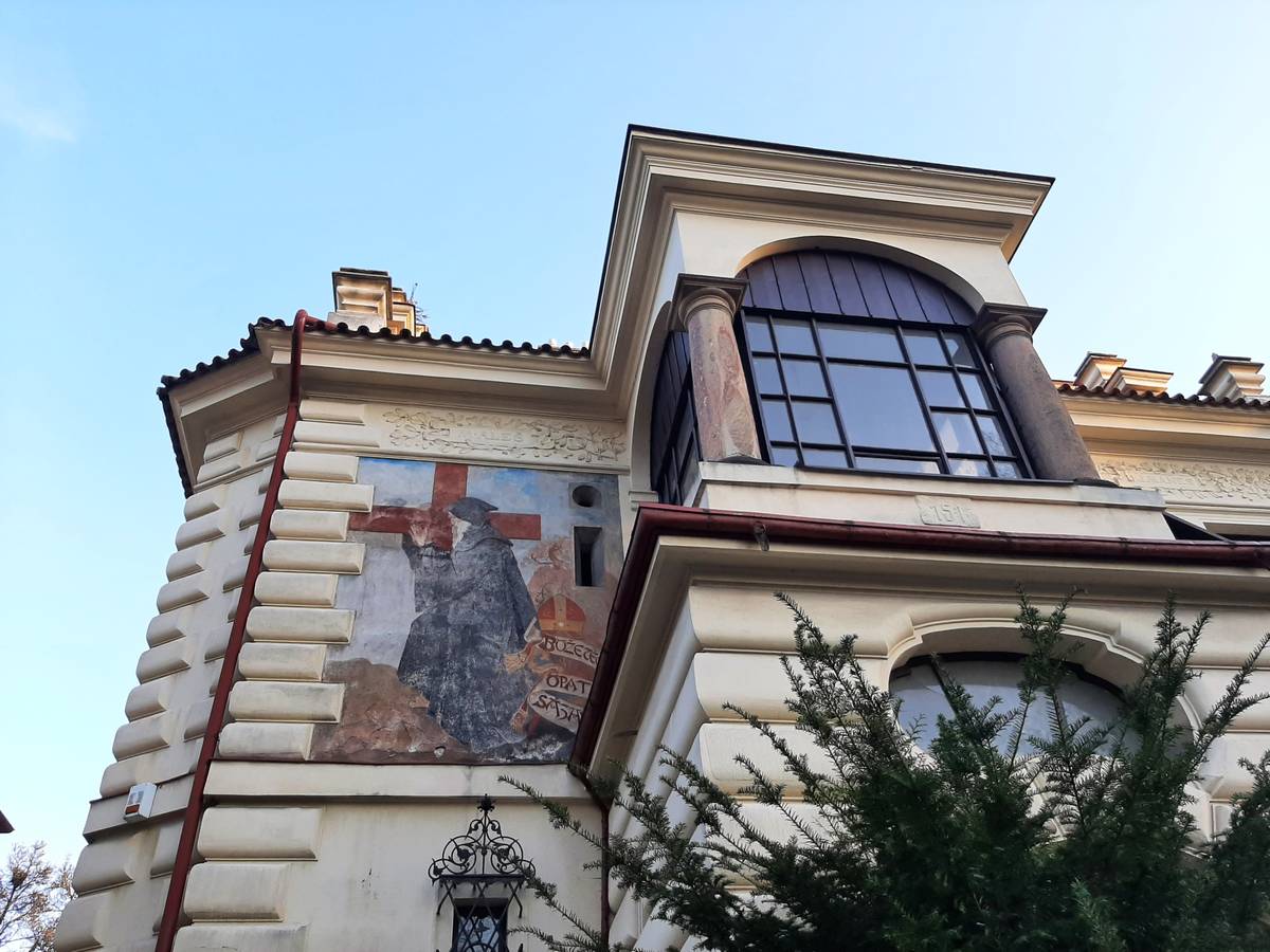 První vila Stanislava Suchardy: Freska od Mikoláše Alše znázorňuje sázavského opata Božetěcha v černém plášti s kapucí nesoucího kříž.