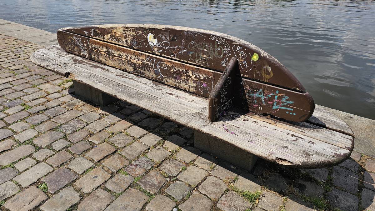 Dřevěná lavička na náplavce během sobotního dne. Všechny vypadají podobně, jedna je na tom ale ještě hůř.