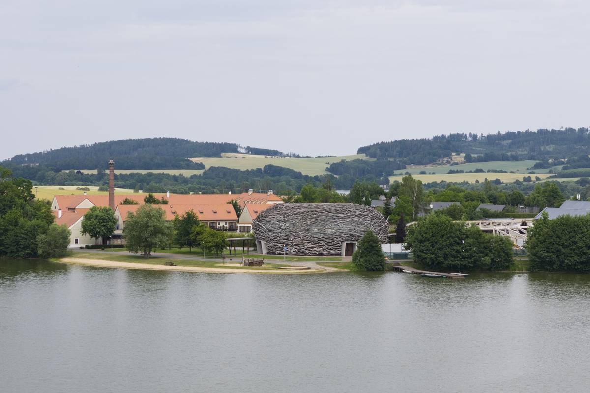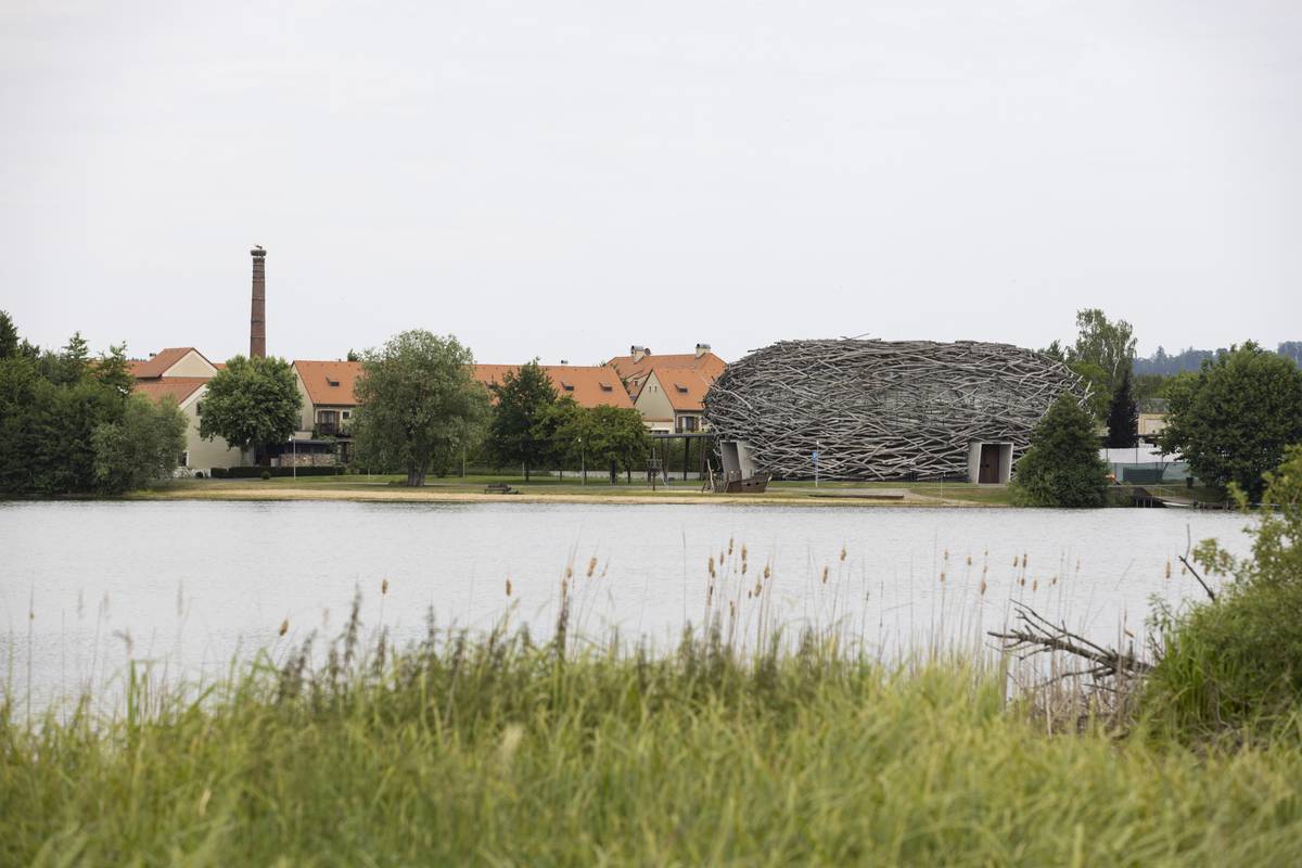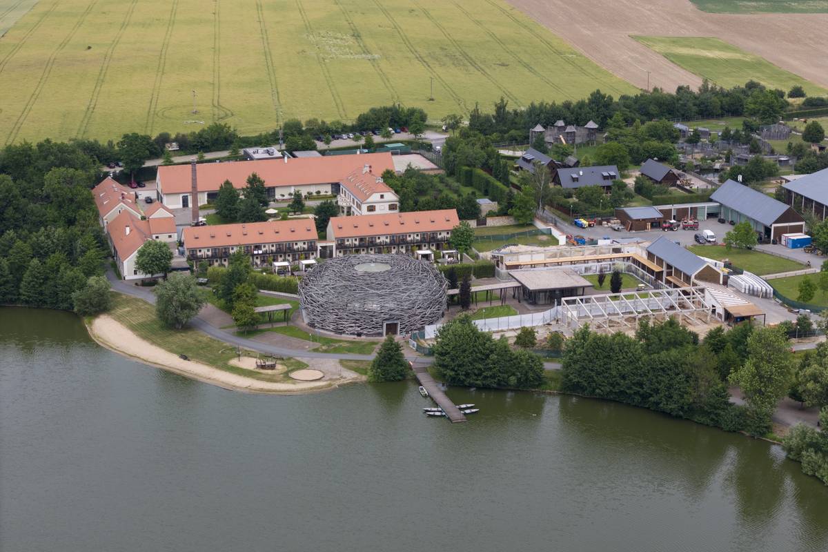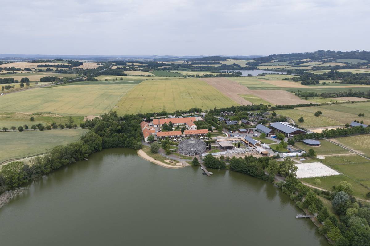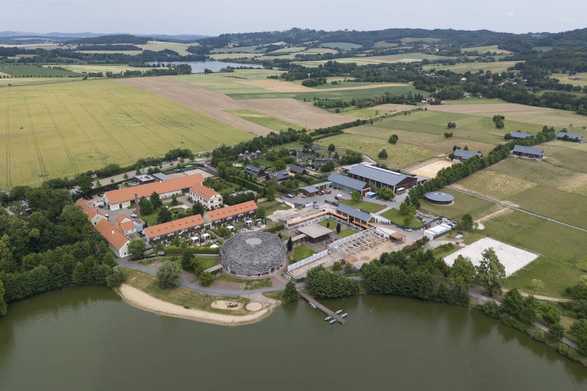 Dominantou středočeského multifunkčního areálu je jízdárna, která vypadá právě jako čapí hnízdo.