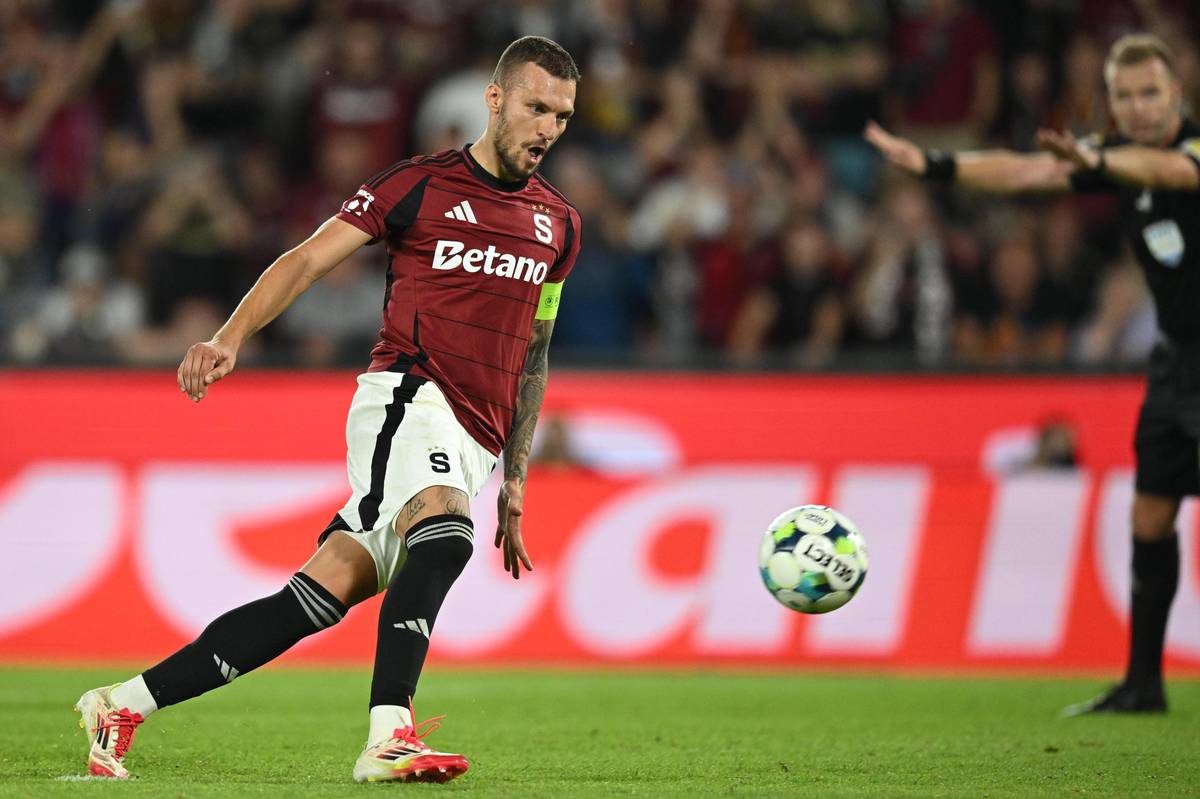Sparťan Lukáš Haraslín zahrává penaltu v nastavení duelu s Mladou Boleslaví.