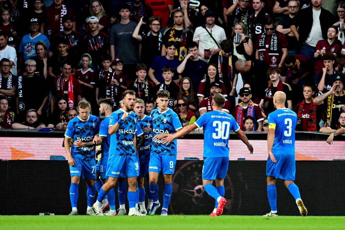 Jan Kuchta oslavuje se spoluhráči ze Sparty vyrovnávací trefu proti Mladé Boleslavi