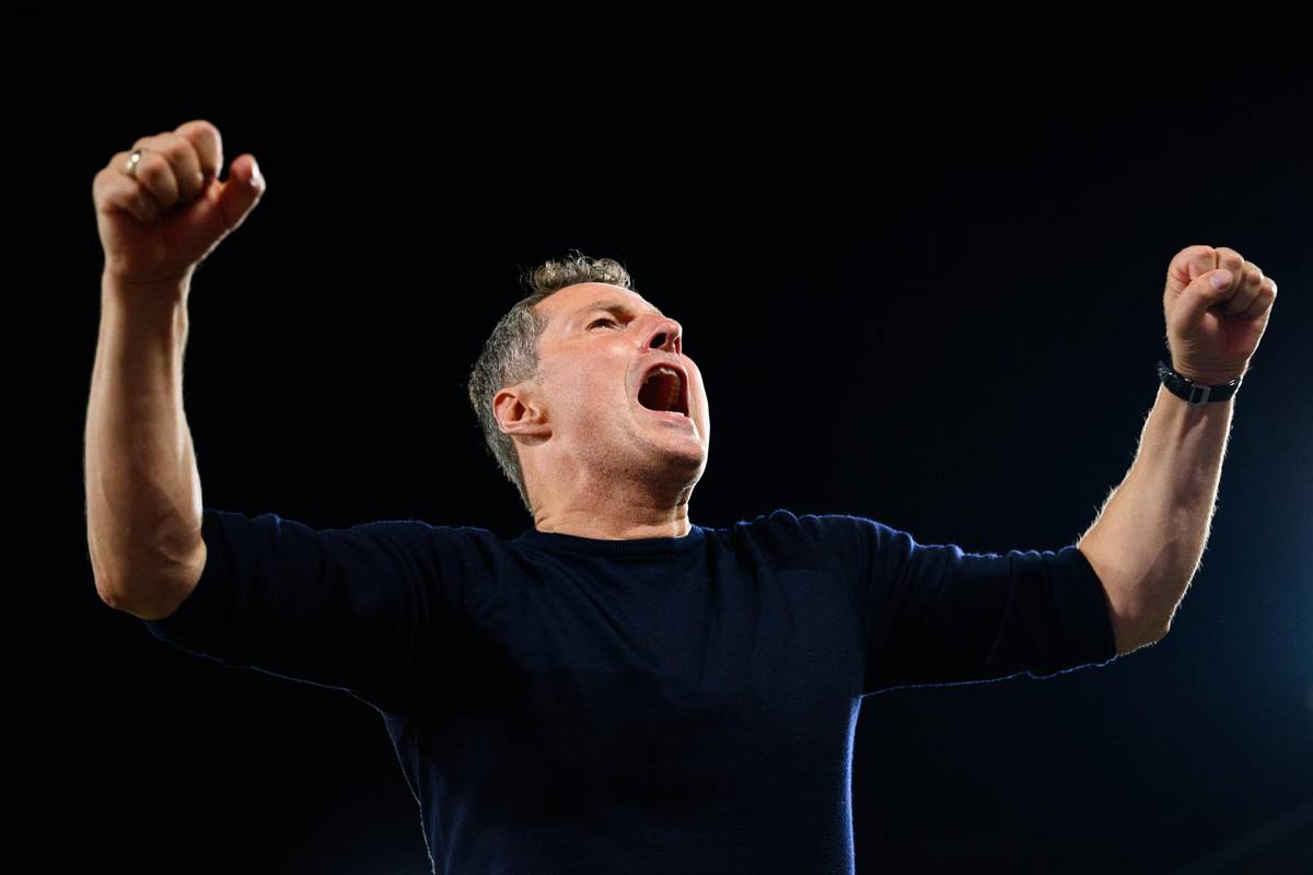 Trenér Sparty Praha Brian Priske oslavuje vítězství nad Mladou Boleslaví.