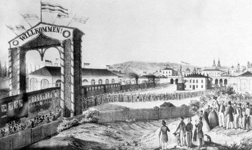Slavnost příjezdu první parní lokomotivy do Prahy 21. srpna 1845 na pozdější Masarykovo nádraží na staré rytině