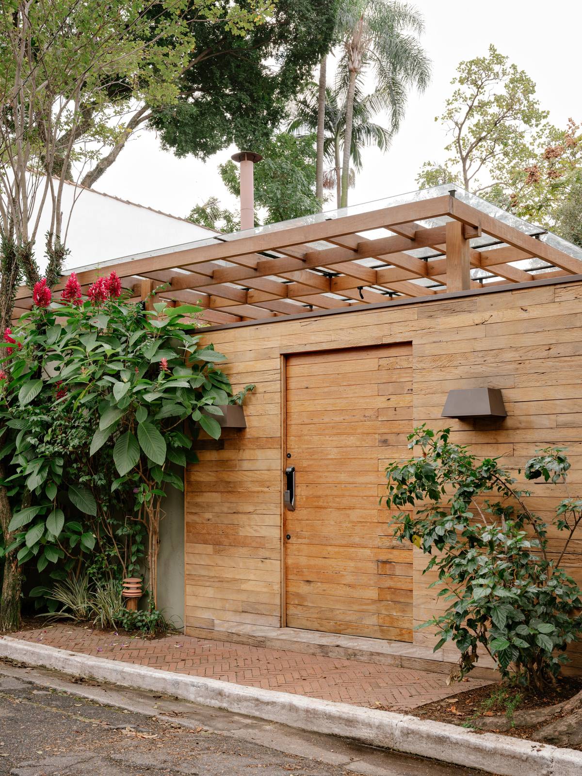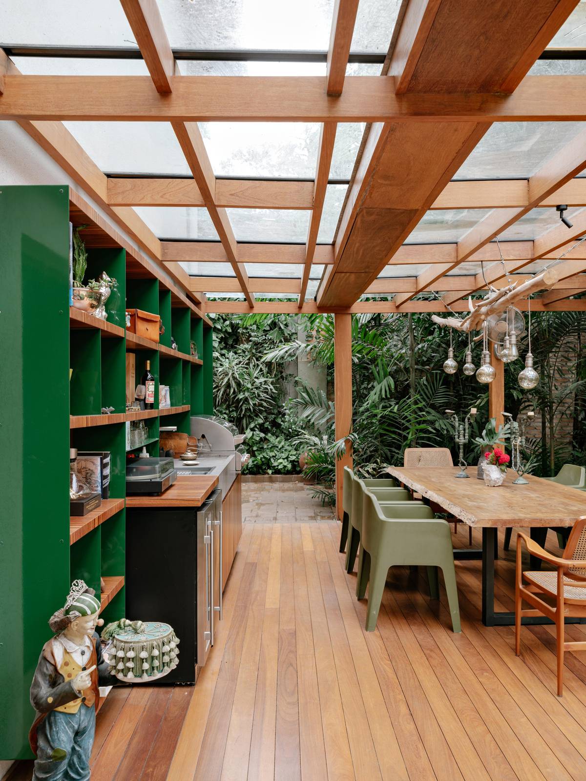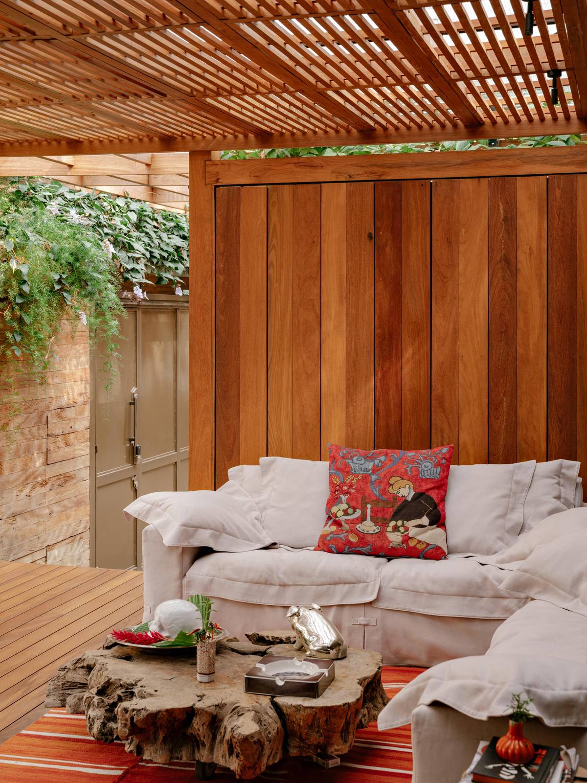 Terasu chrání pergola se skleněným záklopem. Díky tomu je na ní spousta světla, ale neprší na ni.