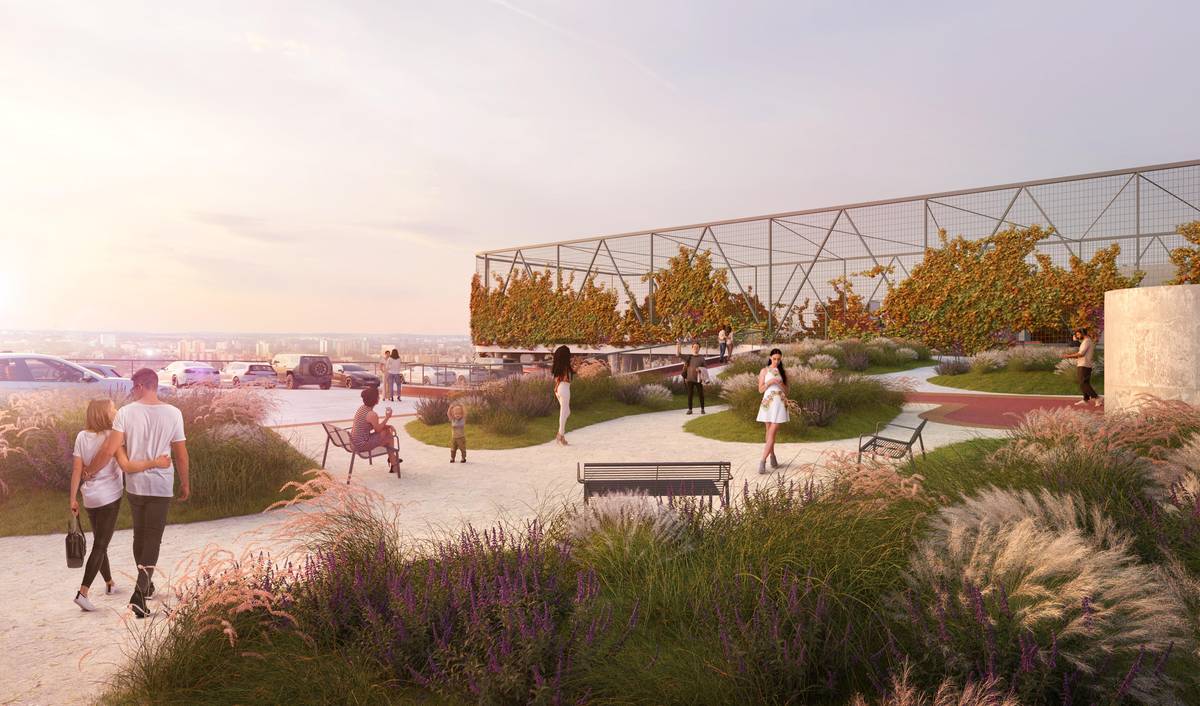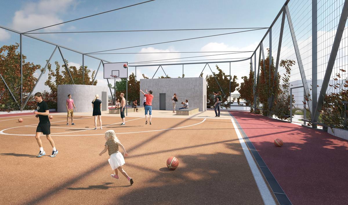 Víceúčelovou funkci dává stavbě i pobytový prostor na střeše, doplněný hřištěm.