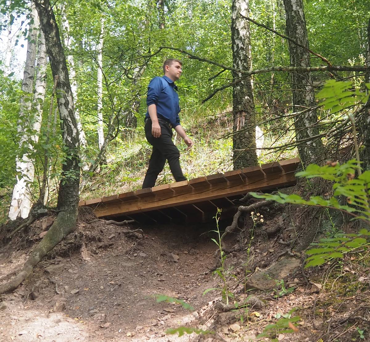 Ostravský primátor Jan Dohnal si zkouší jednu z nových lávek na trase na haldu Ema.