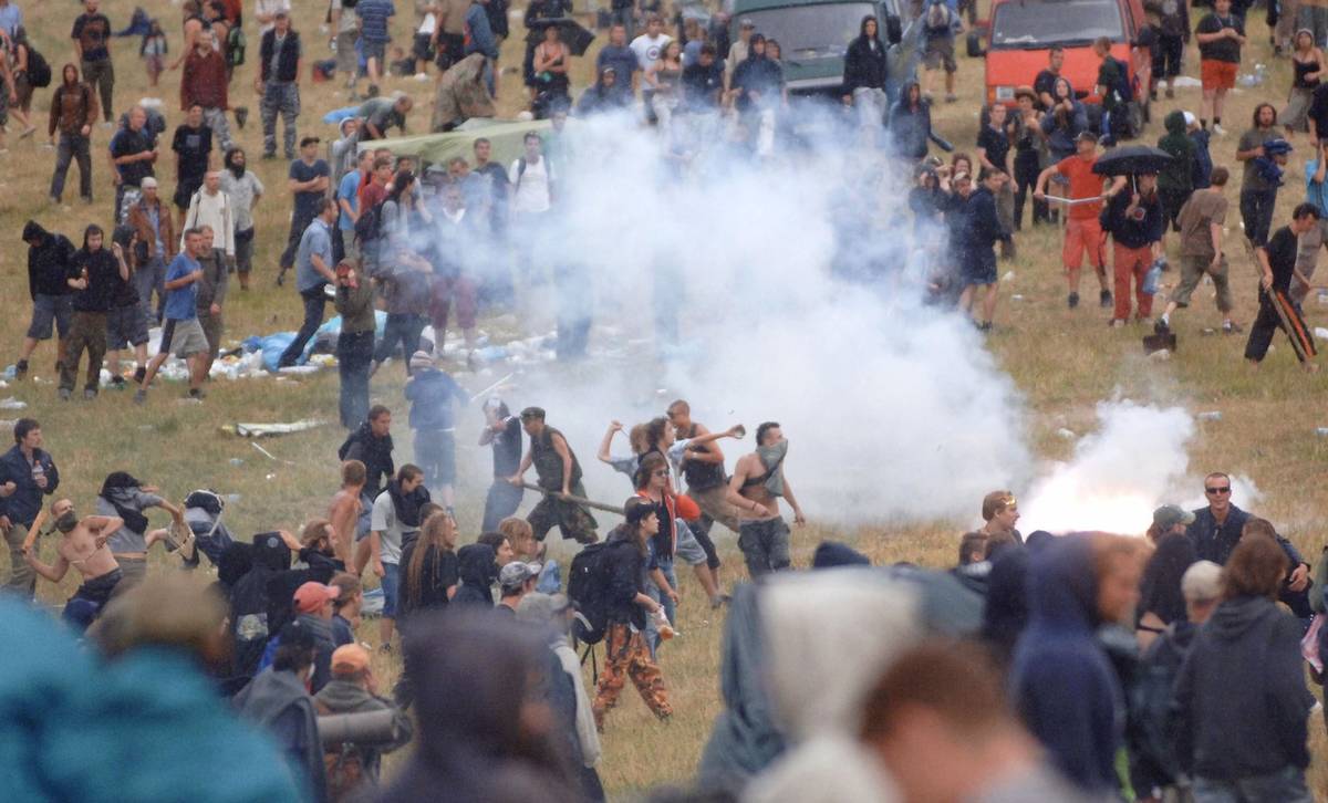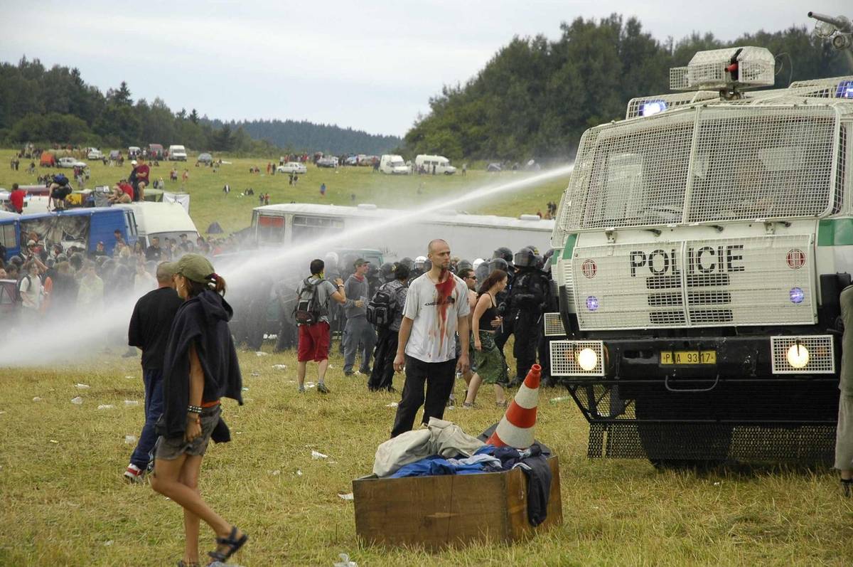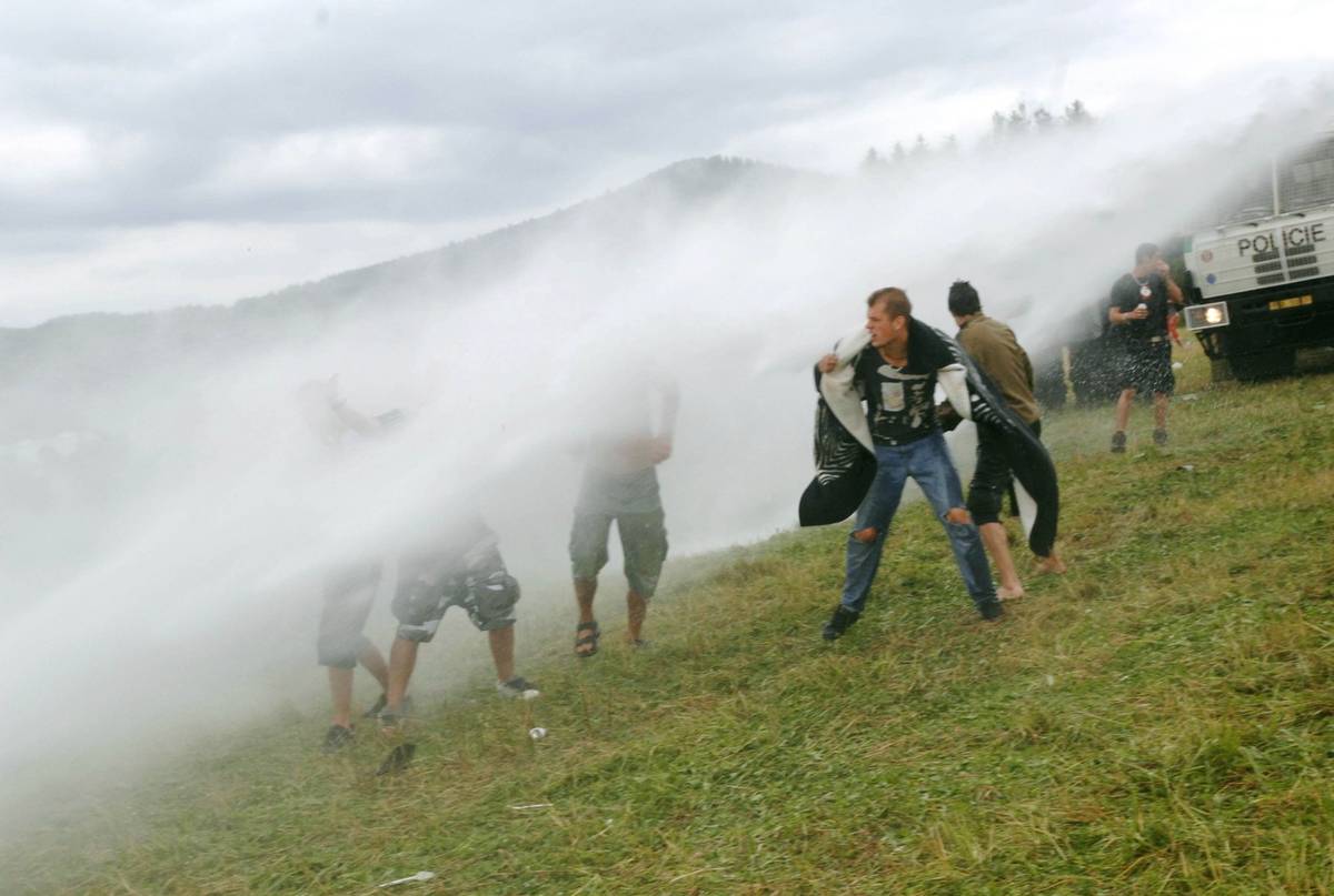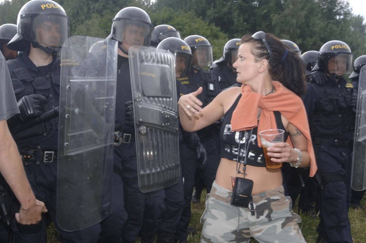 Účastníci po policistech házeli plechovky s pivem nebo klacky, ale víceméně se to obešlo bez aktivního odporu.