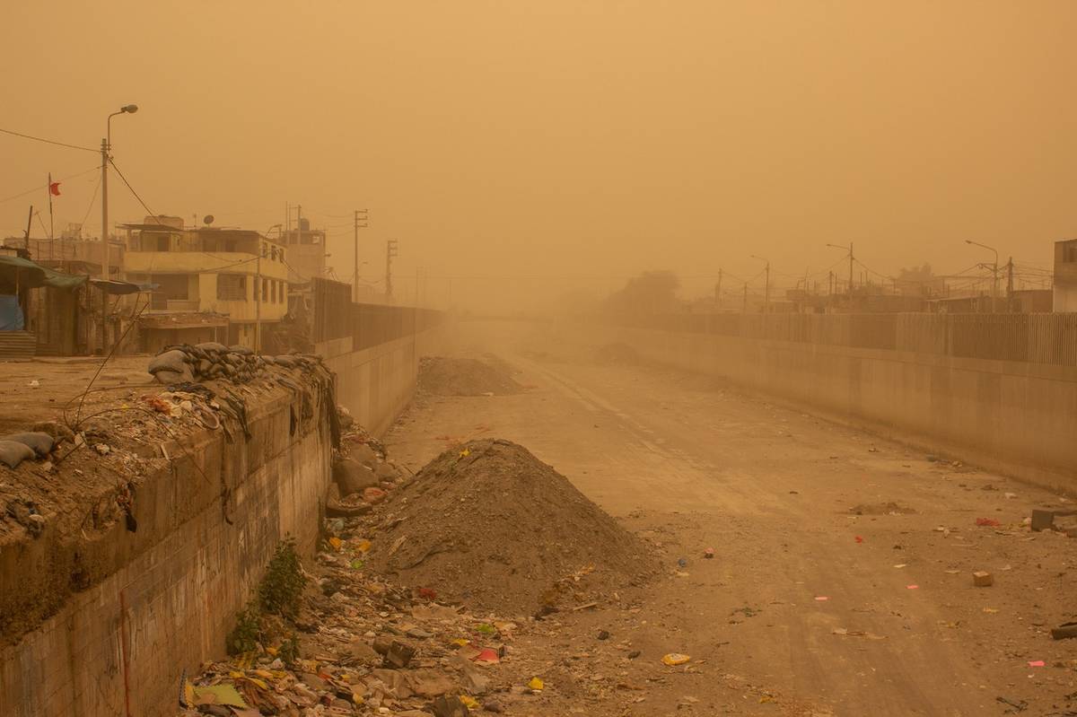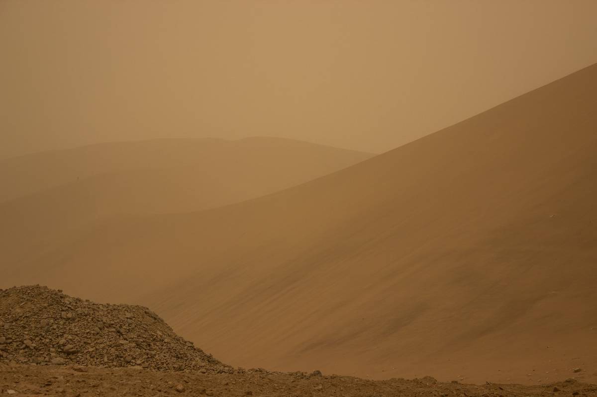 Silný vítr zvedl obrovské množství prachu a písku, které zcela zakrylo oblohu a výrazně snížilo viditelnost.