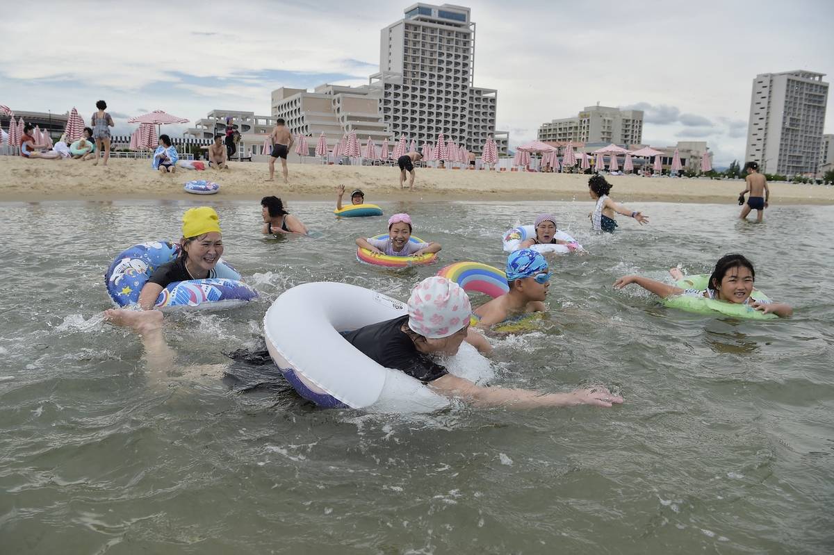 Rozsáhlá turistická zóna Wonsan Kalma na východním pobřeží Severní Koreji se tento týden otevřela veřejnosti. (Domácí turisté se v první den otevření vrhají do moře, 1. července.)