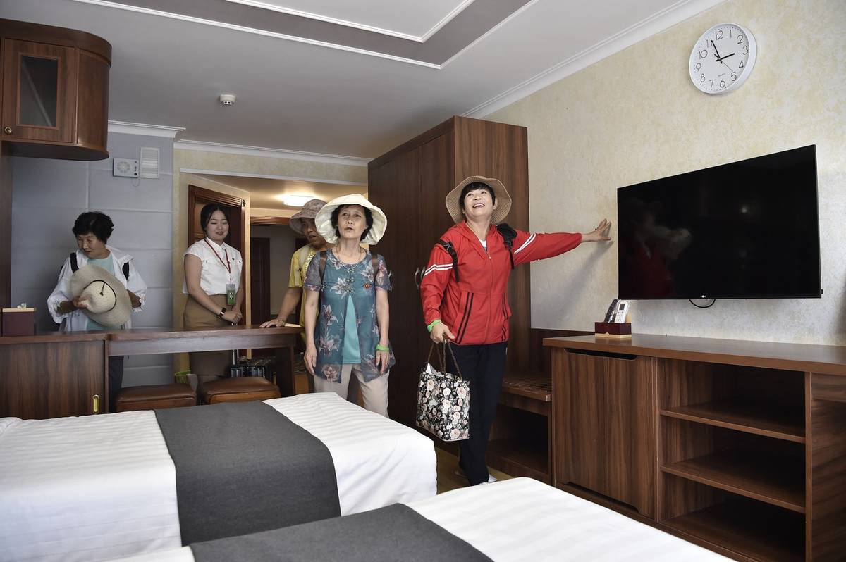První turisté oblasti Wonsan Kalma si 1. července prohlížejí nový hotelový pokoj.