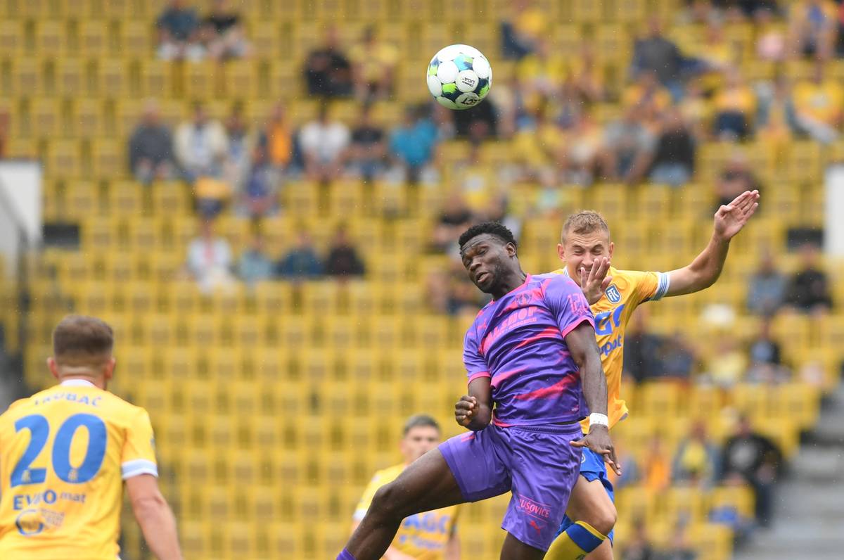 Albert Labík z Karviné v souboji s Jossem Didibou ze Zlína.