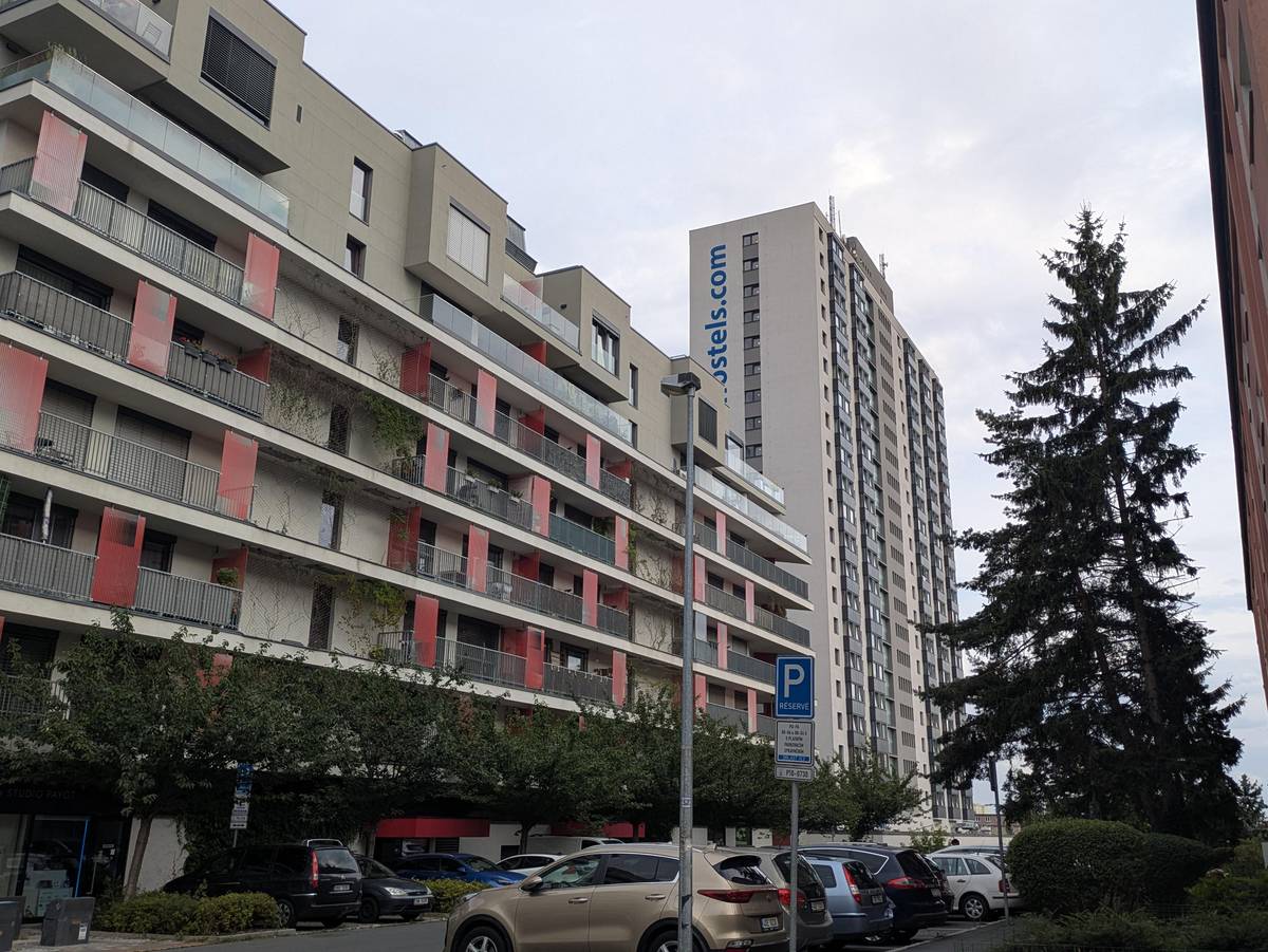 Jedenadvacetipatrový hostel s kapacitou téměř 1200 lůžek stojí uprostřed bytové zástavby.