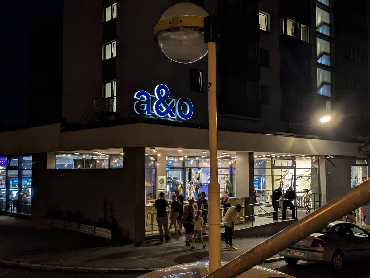 Noční ruch před hostelem.