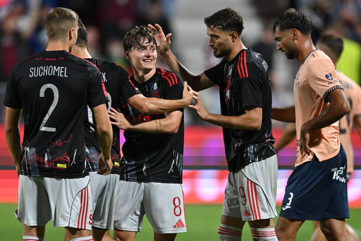 Útočník Sparty Albion Rrahmani (vlevo) se raduje z gólu na 1:0 v Pardubicích.