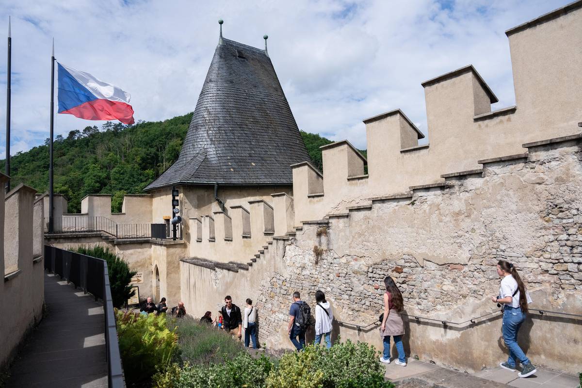 Turisté čekající na otevření katedrály na Pražském hradě čekají ve frontě táhnoucí se až k bazilice svatého Jiří.