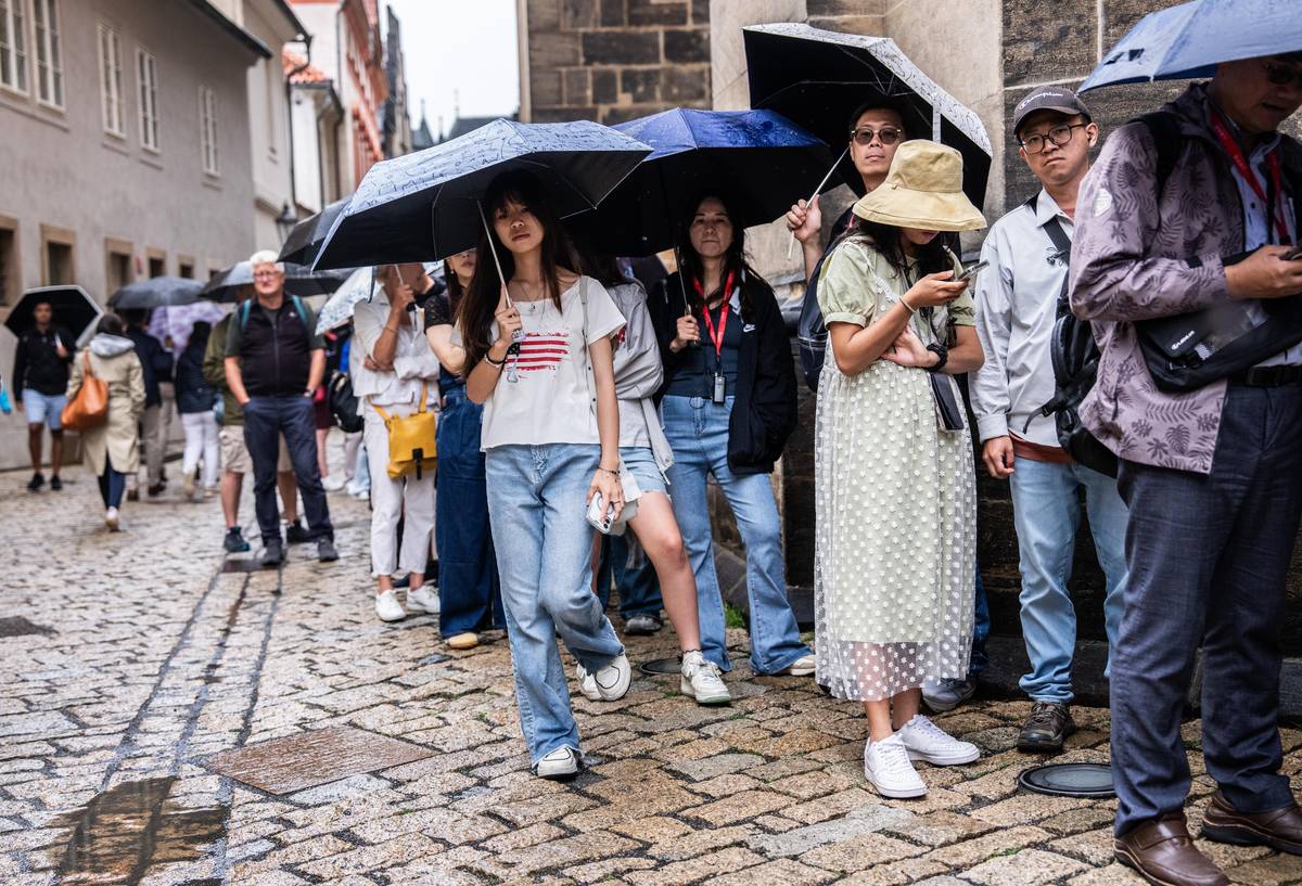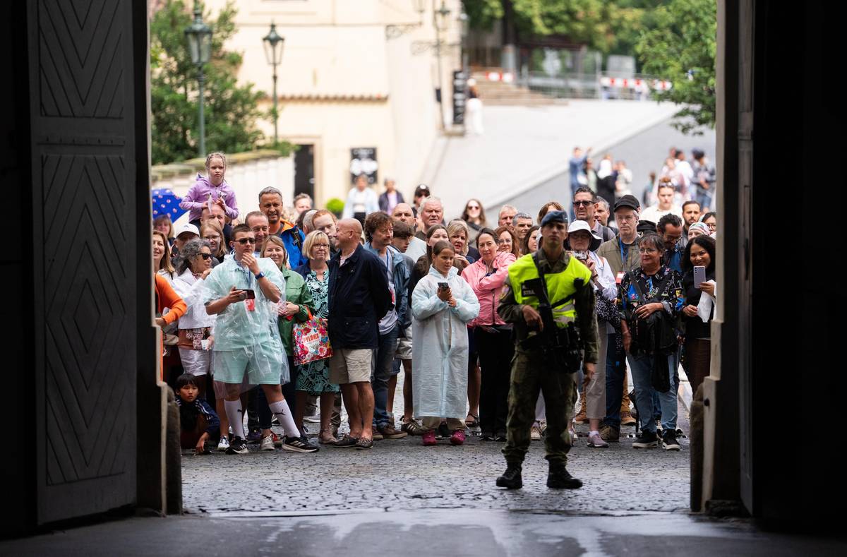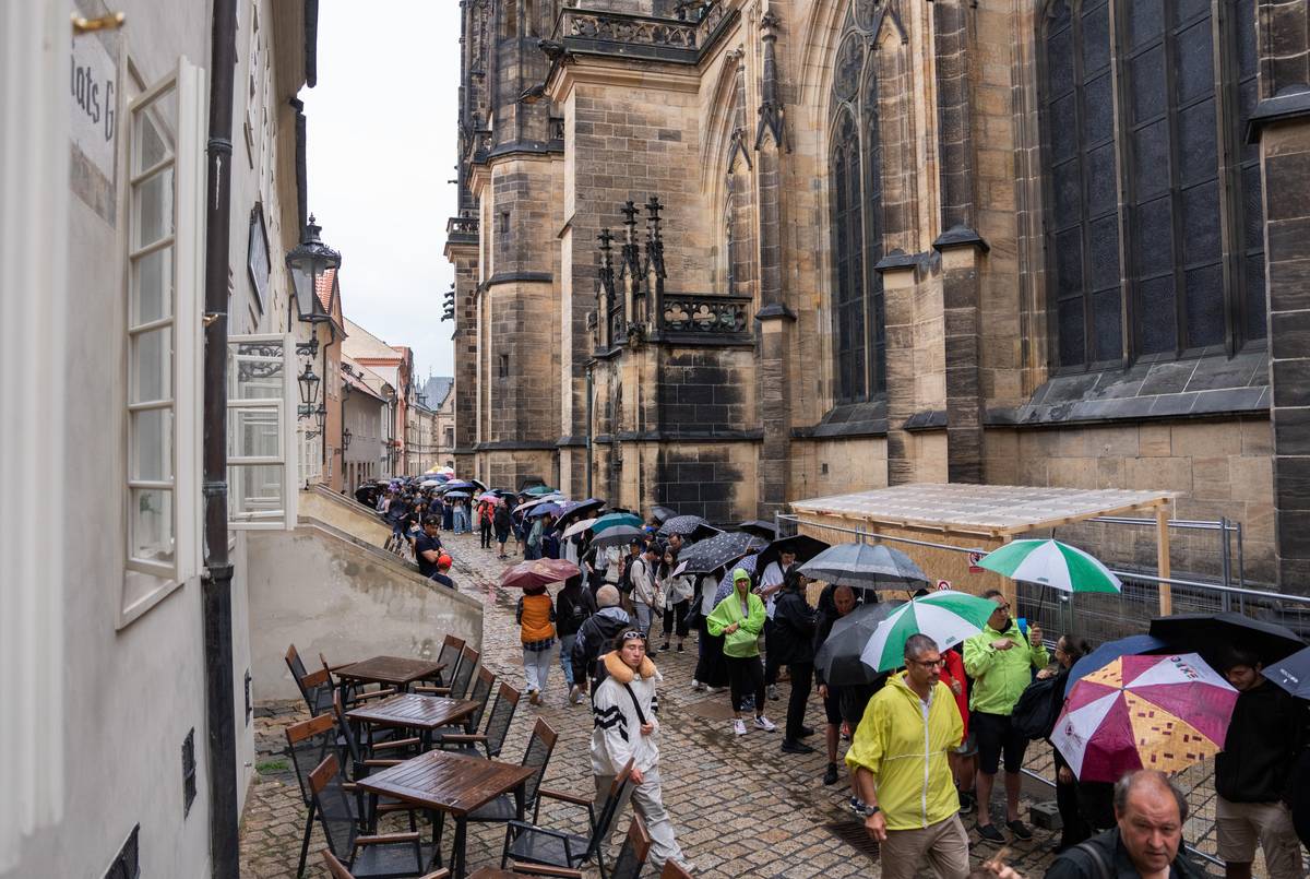 Ani vytrvalý déšť neodradí návštěvníky čekat v neděli ve frontě do katedrály sv. Víta desítky minut.