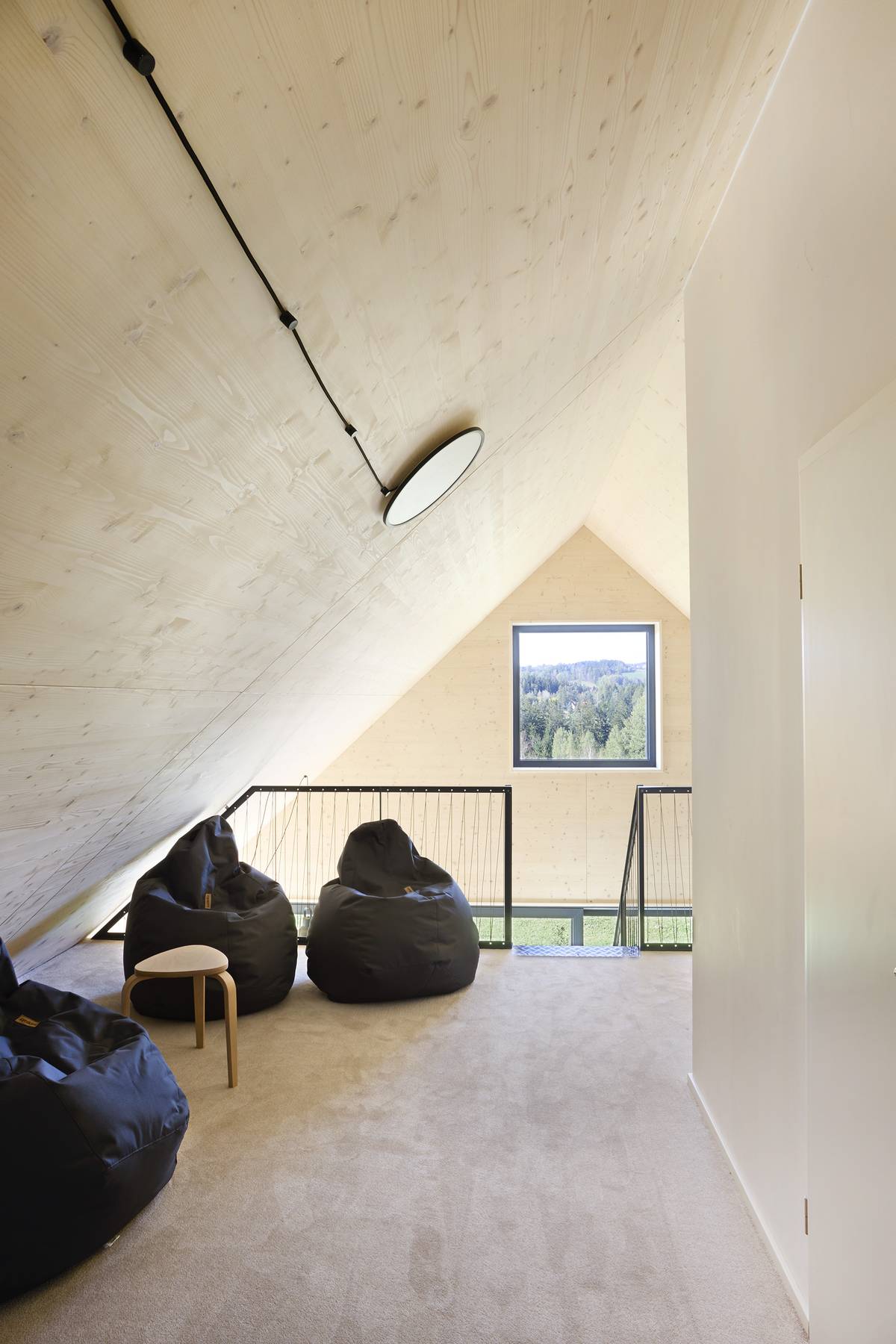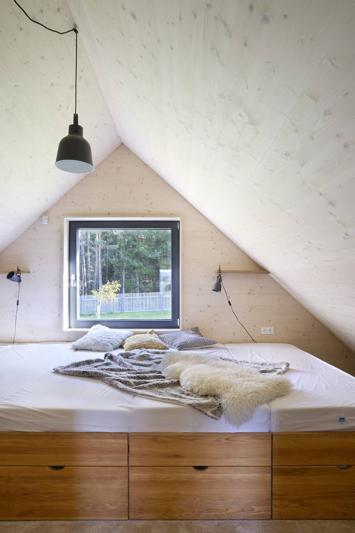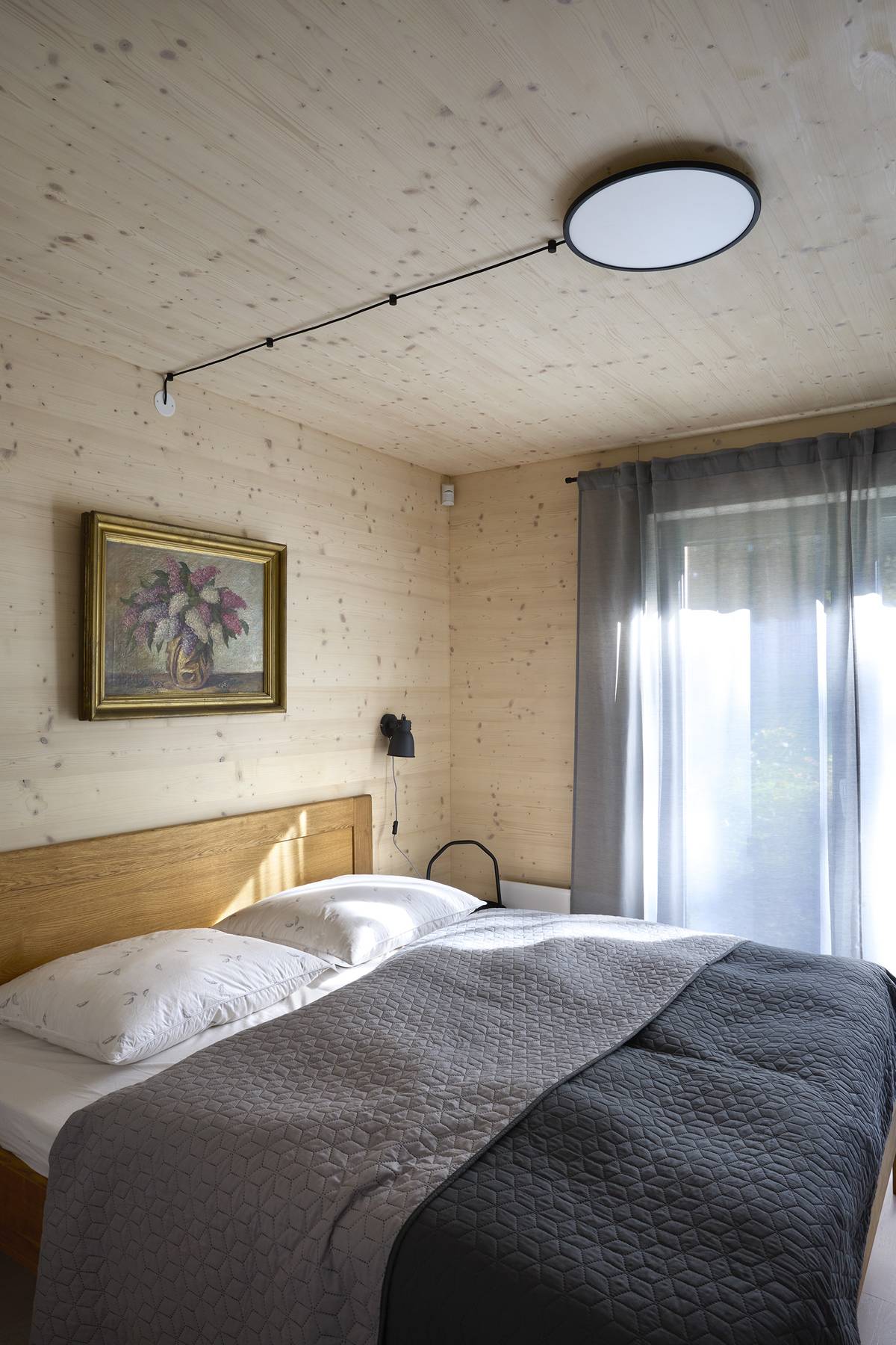 Ložnice v přízemí vypadá díky přiznaným CLT panelům na stěnách a na stropě velmi přirozeně.