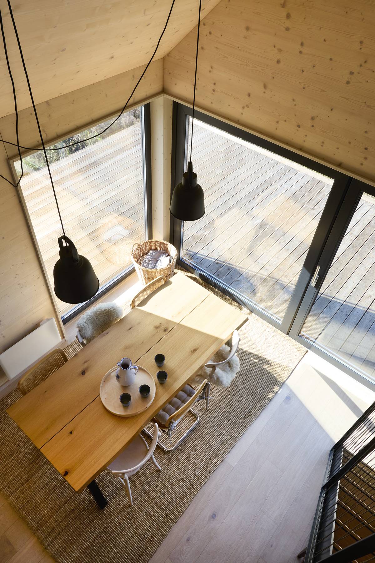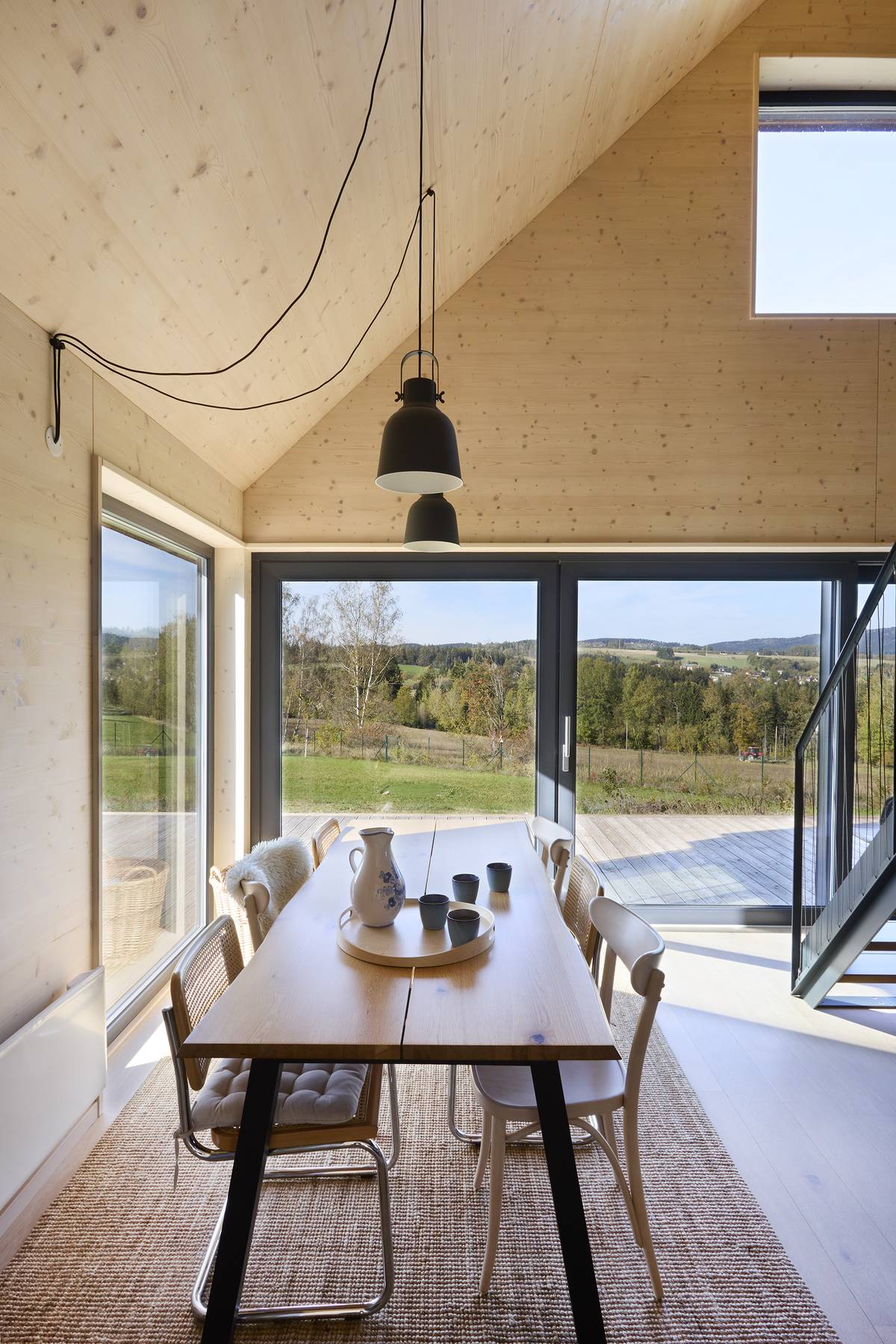 Od stolu pro celou rodinu je díky velkoformátovým oknům vidět do krásné krajiny.