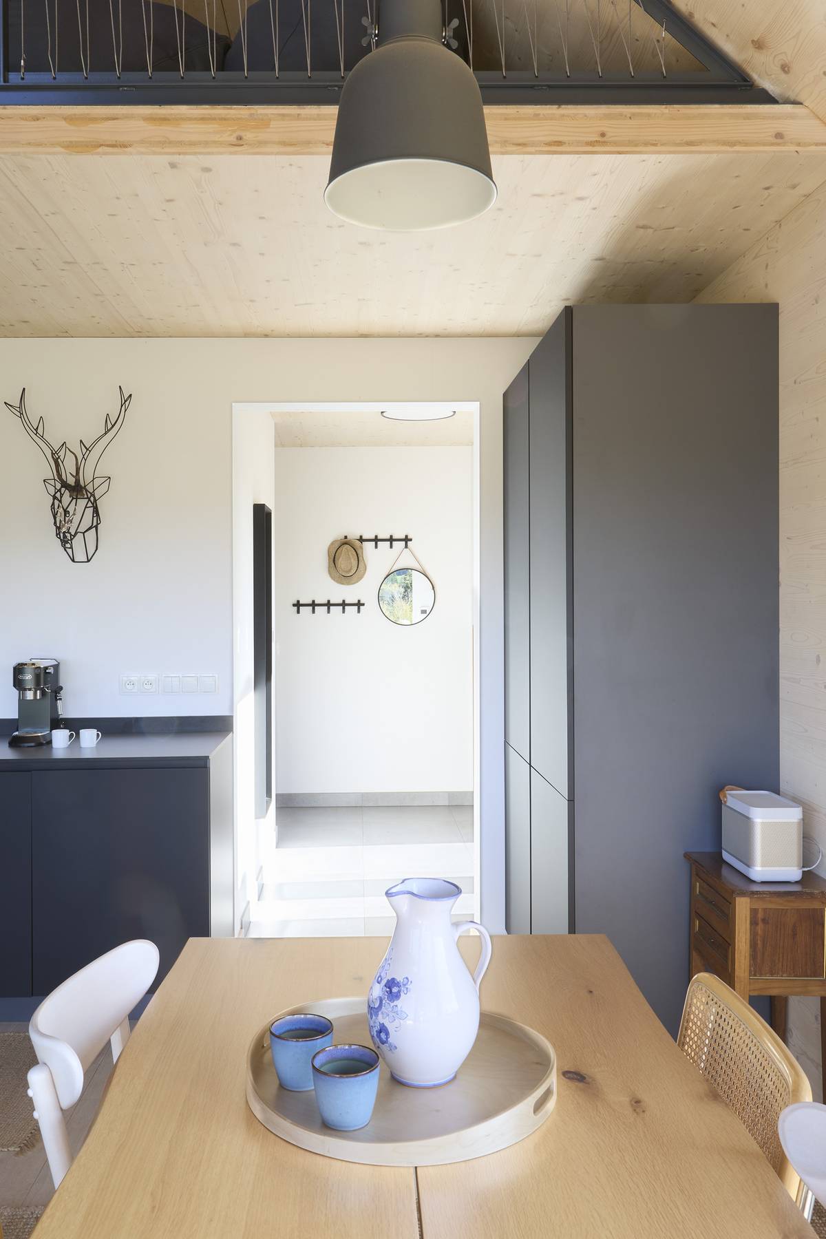 Z předsíně vstupujeme do kuchyně s jídelnou. Vnitřní stěny jsou z pohledového dřeva v kombinaci s bílou výmalbou.