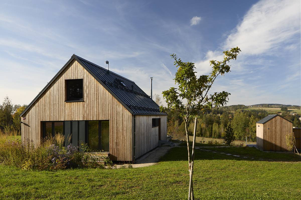 V jednotném stylu jsou vedle domu navrženy sklad a sauna, takže celý pozemek se všemi objekty působí kompaktně a uspořádaně.