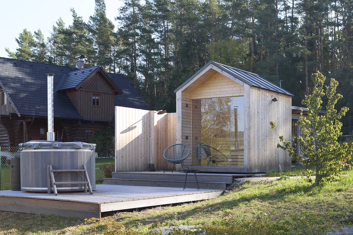 Rodinné venkovní wellness centrum zahrnuje saunu a koupací sud, v němž lze vodu ohřívat.
