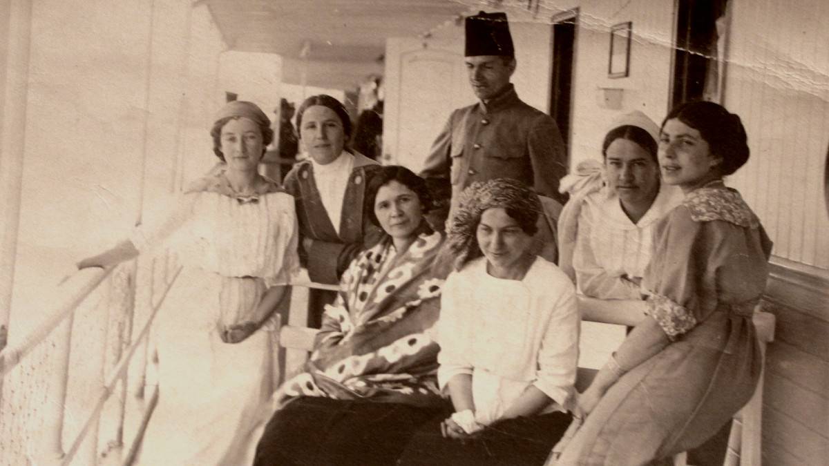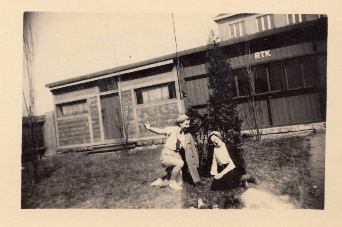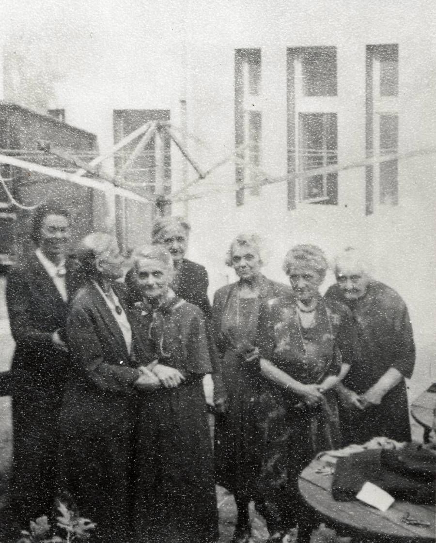 Poslední fotografie ruské pedagožky Vladimírovny Žekuliny (první vpravo) na dvoře Profesorského domu před jejím odjezdem do Belgie v roce 1949. Většina Rusů byla ze svých domů v Dejvicích a Bubenči na začátku 50. let vystěhována.