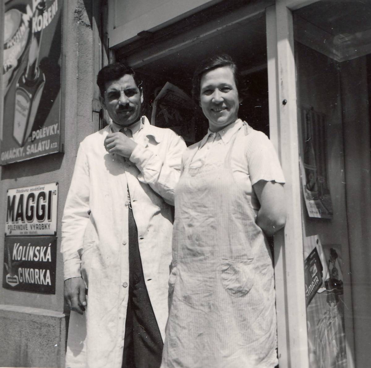 Vladimír Pivovarov s manželkou před svým obchodem v přízemí ruského dvojdomu „Patriotika“ v Koulově ulici 6/8. V tomto domě žili matka, sestra a bratr spisovatele Vladimira Nabokova.