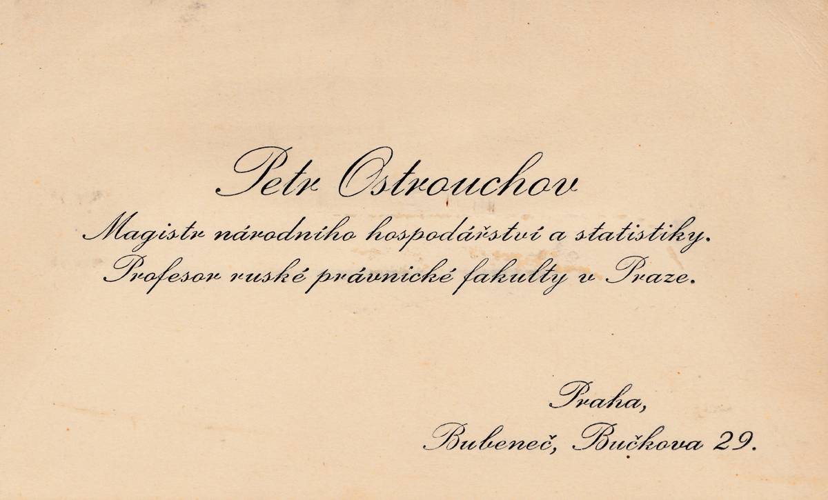 A ještě pár dobových připomínek: Vizitka jednoho z obyvatel Profesorského domu národohospodáře a statistika Petra Ostrouchova.