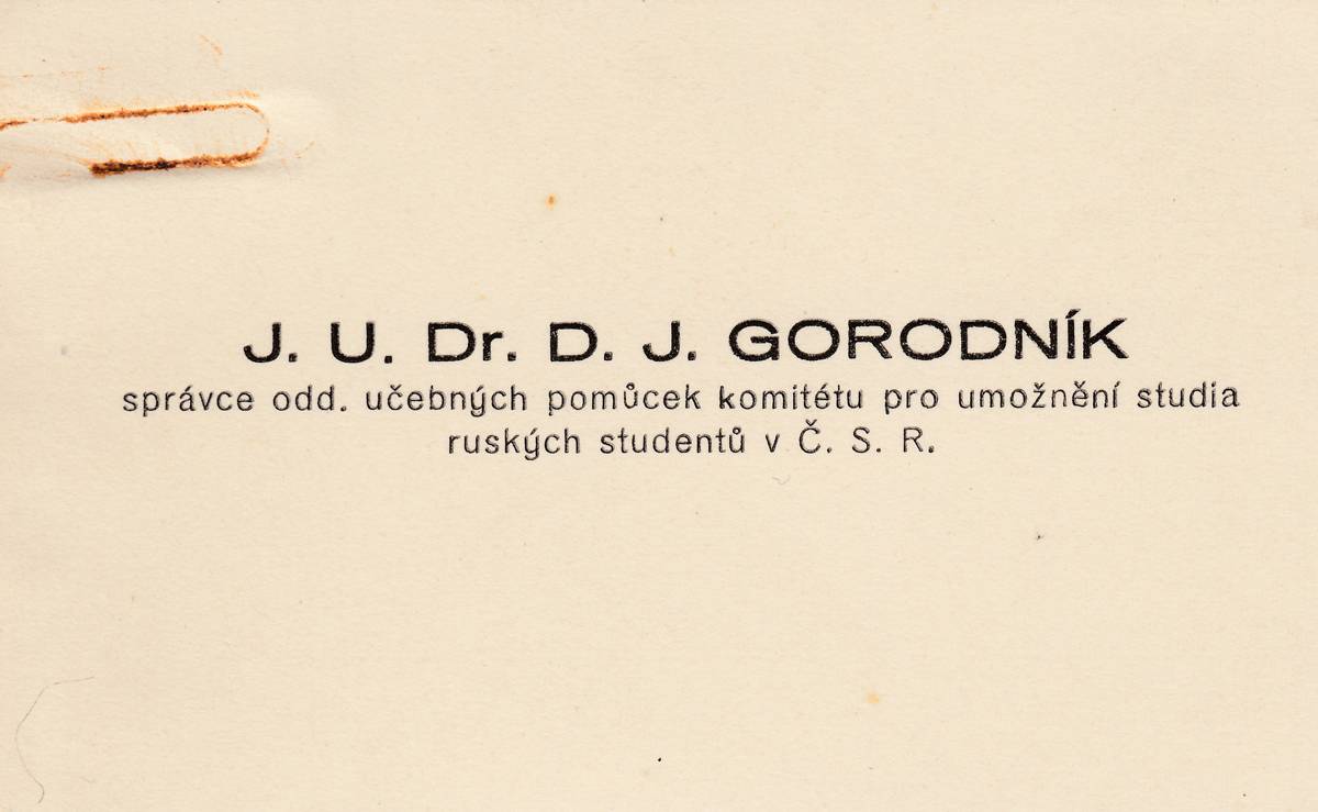 Vizitka správce oddělení učebních pomůcek komitétu pro umožnění studia ruských studentů v ČSR.