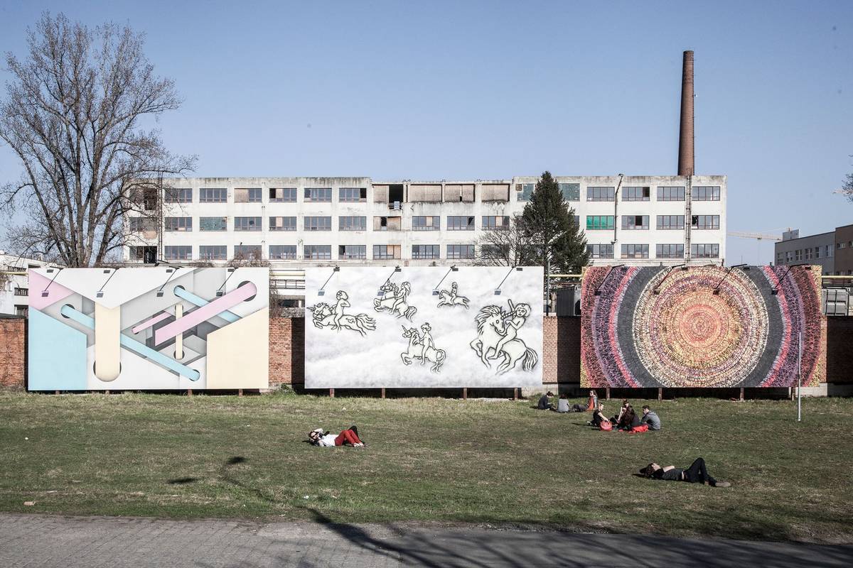 Muraly na Pragovce: zleva díla Jana Kalába, Jakuba Janovského a Michala Škapy.