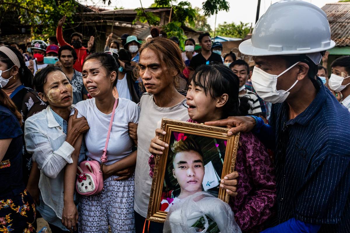 14. března: Protestující drží padlého. V zemi je zákaz sledování satelitní televize s tím, že vysílání ze zahraničí ohrožuje národní bezpečnost. Za porušení zákazu Barmáncům hrozí vězení. Převážná většina obyvatel byla také odříznuta od internetu, čímž chce armáda zastavit protesty.