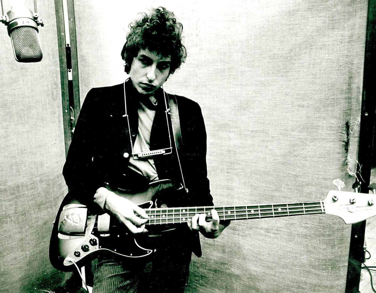 S baskytarou Fender a harmonikou v lednu 1965, půl roku před Newportským folkovým festivalem, kde představil svou rockovou kapelu.