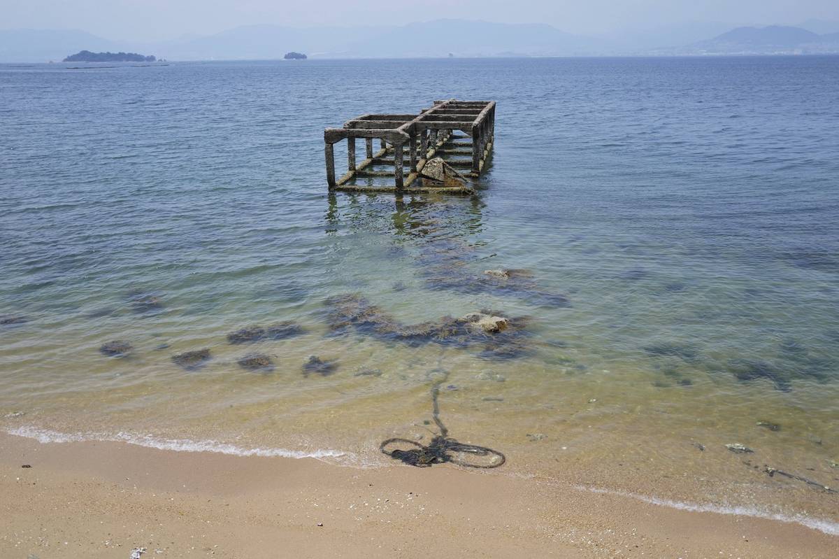„Když jsem uviděl první skupinu pacientů, kteří dopluli na ostrově, byl jsem šokem bez slov,“ napsal v roce 1992 bývalý armádní zdravotník Jošitaka Kohara. (Dělníci staví na pobřeží Ninošimy regály pro pěstování ústřic, místní speciality, 8. července.)