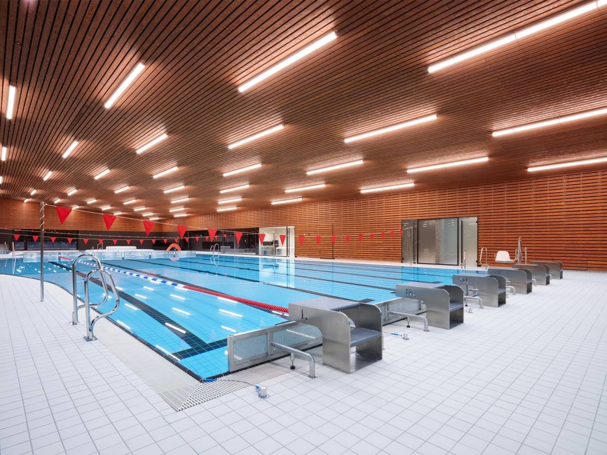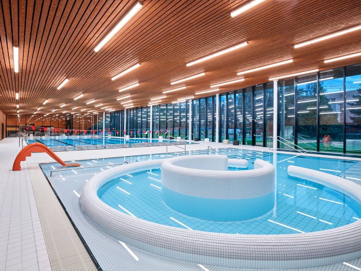 Objekt krytého plaveckého bazénu je podle architektů ovlivněný svažujícím se terénem, zvláště pokud jde o předsunutou střechu chránící před paprsky letního slunce nebo o vztah exteriéru a interiéru. "Vnitřní prostor plavecké haly je na jižní straně bohatě otevřen šestimetrovou prosklenou stěnou, která se zvlnila na hranici dvou rozdílných světů v délce 60 metrů," vysvětlují autoři stavby.