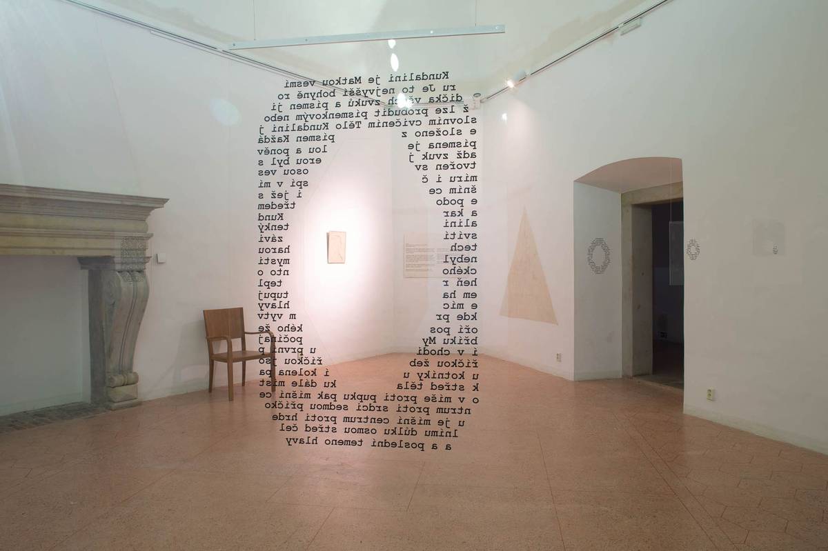 Na snímku z výstavy Setiny je obraz promítaný osciloskopem na strop.