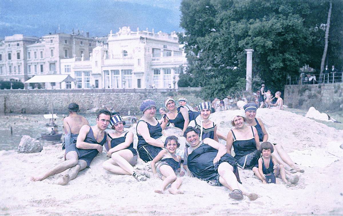 Turisté na pláži v chorvatské Opatiji (zhruba 1905).