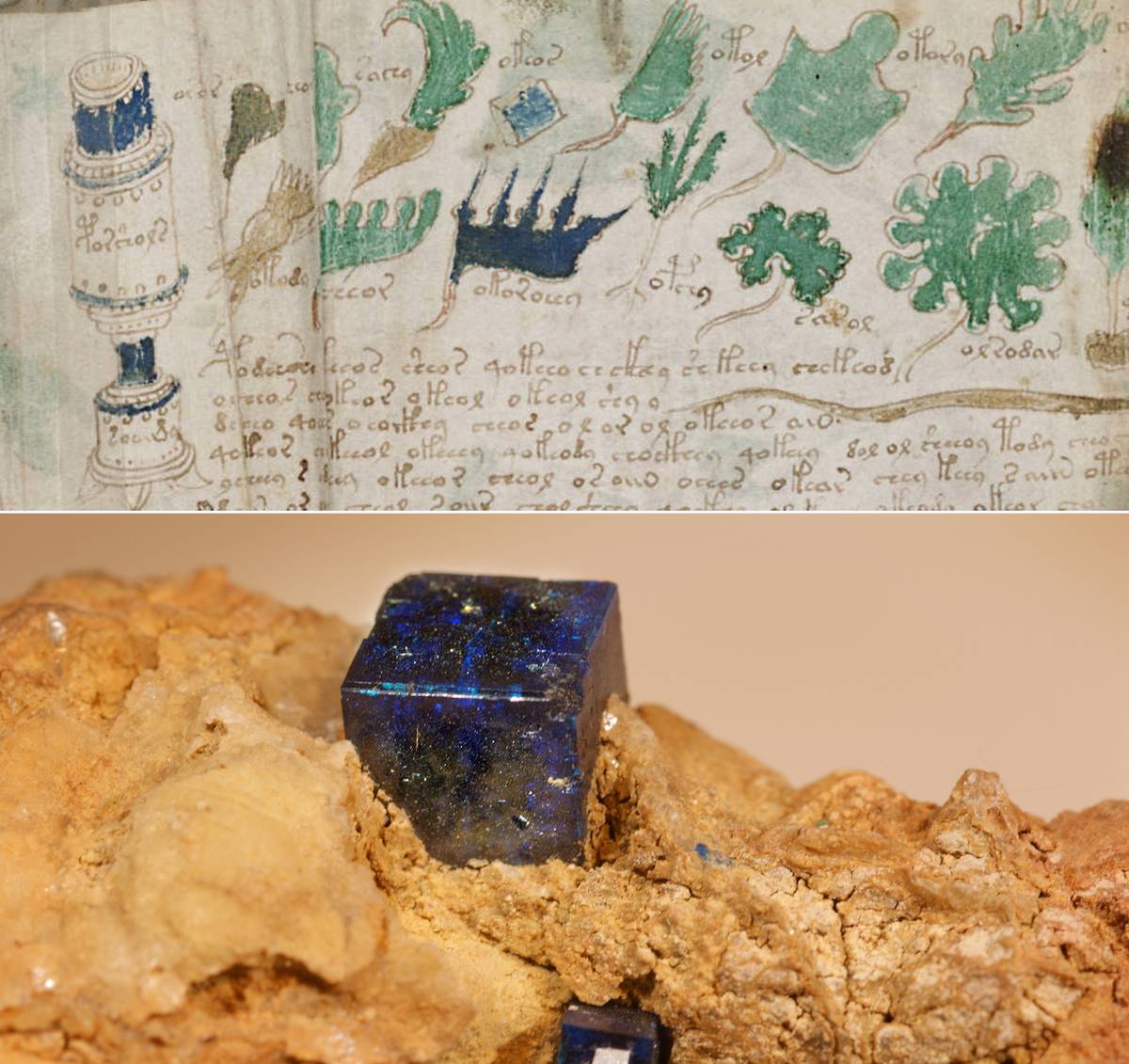 Modrý minerál boleit (v detailu rukopisu v horní řadě uprostřed) se těží v mexických dolech Baia California.