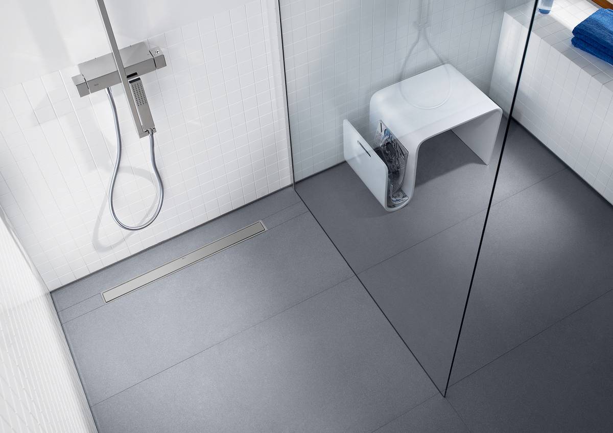 Odtokovým žlabem se systémem In-Drain mizí voda ze sprchování decentně. Kovová mřížka je k dispozici v rozmanitých tvarech.