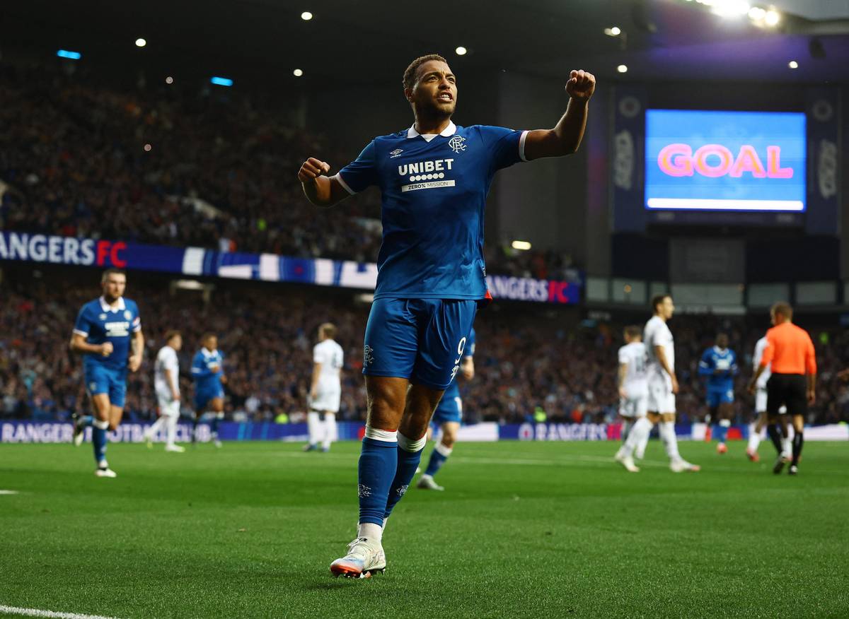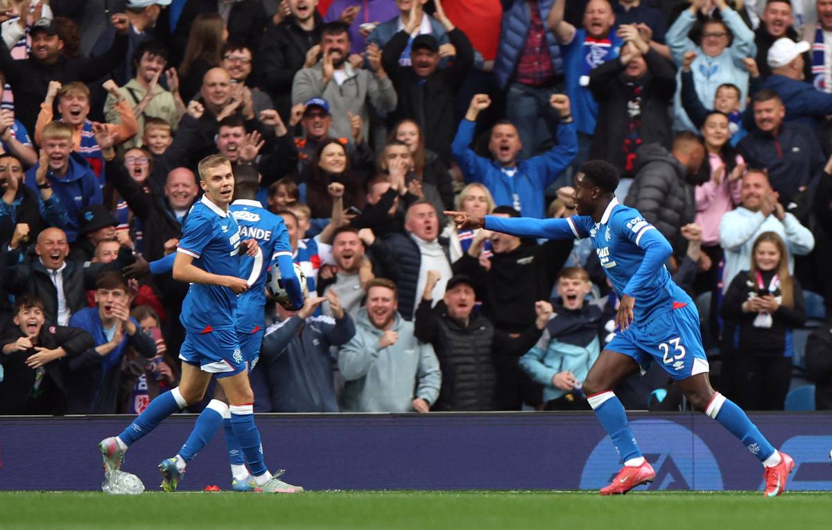 Útočník Rangers Djeidi Gassama slavící jeho druhou branku v zápase