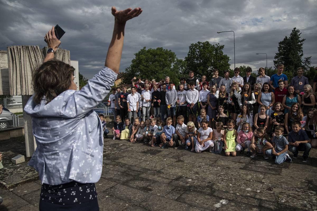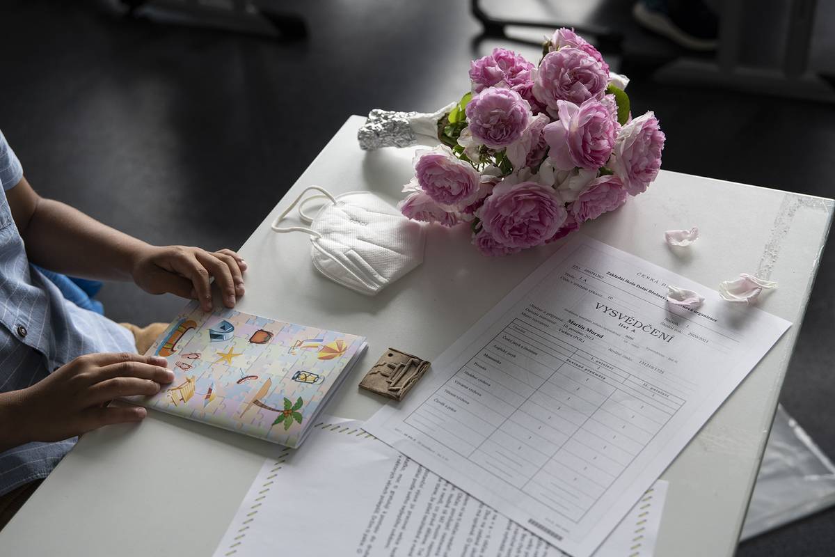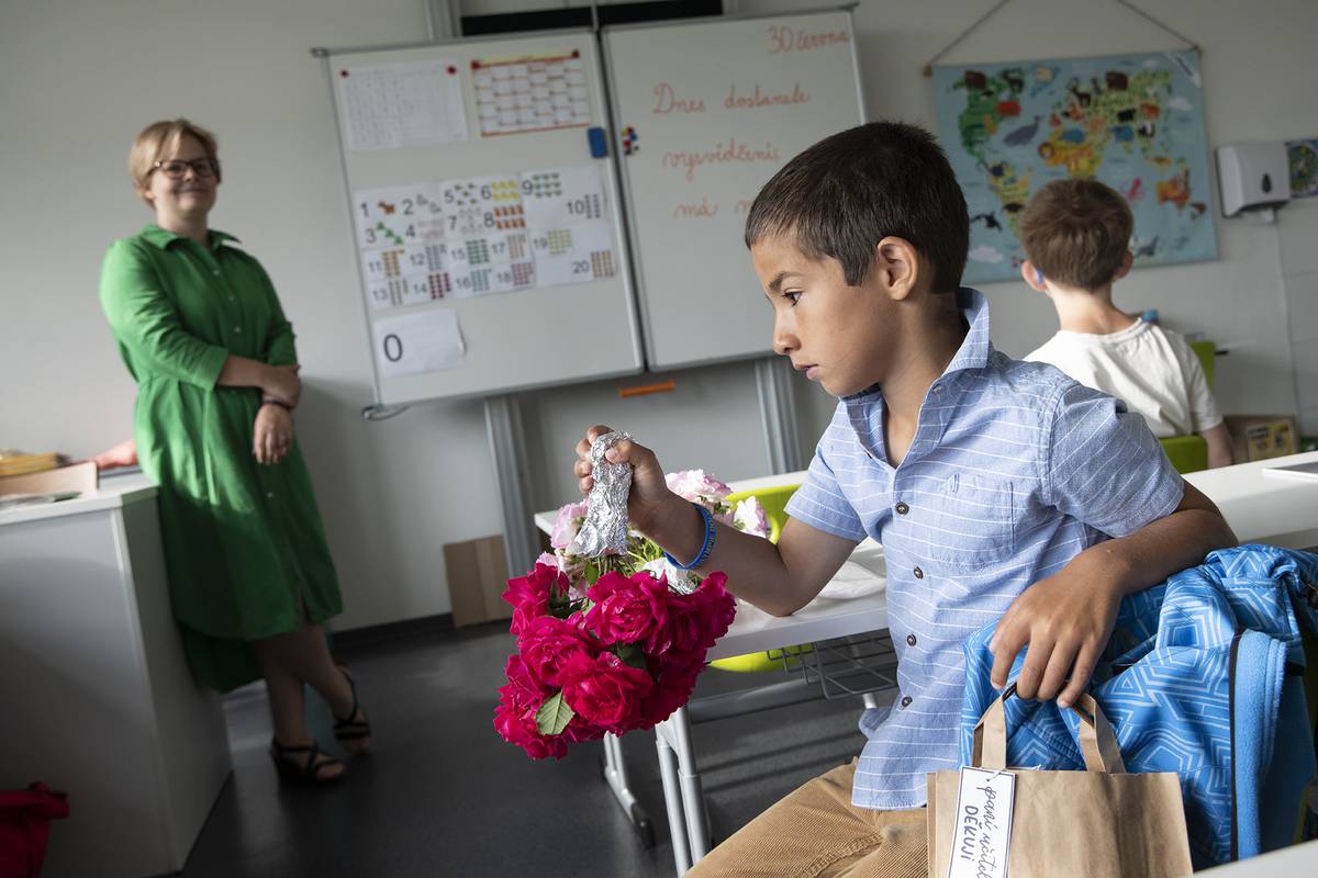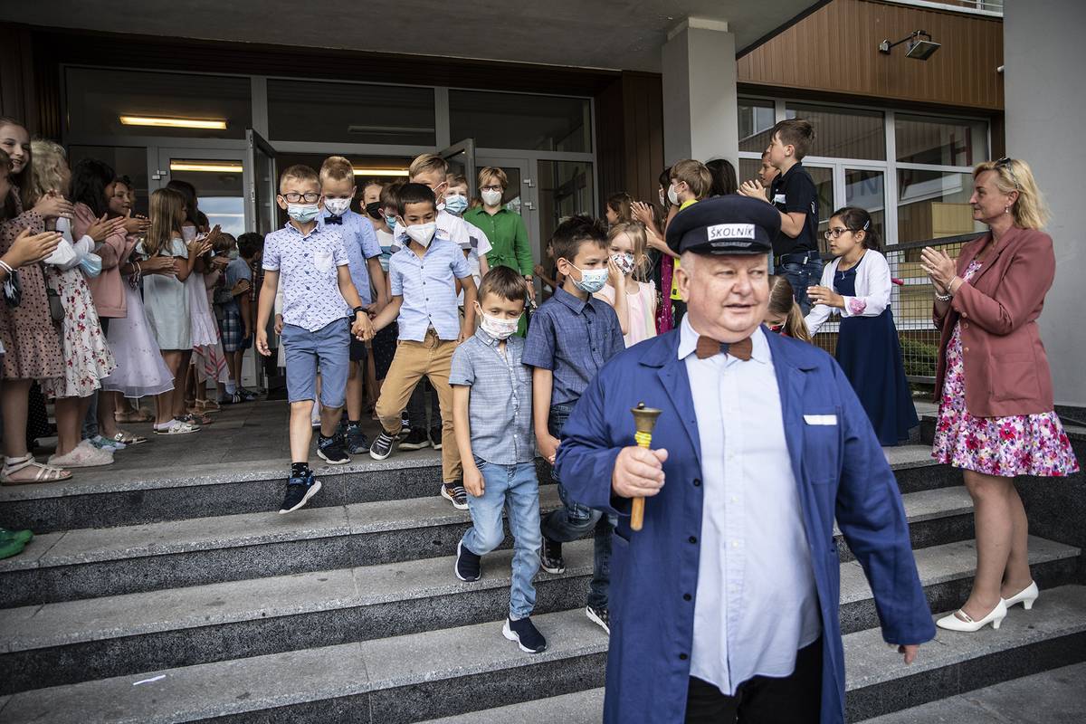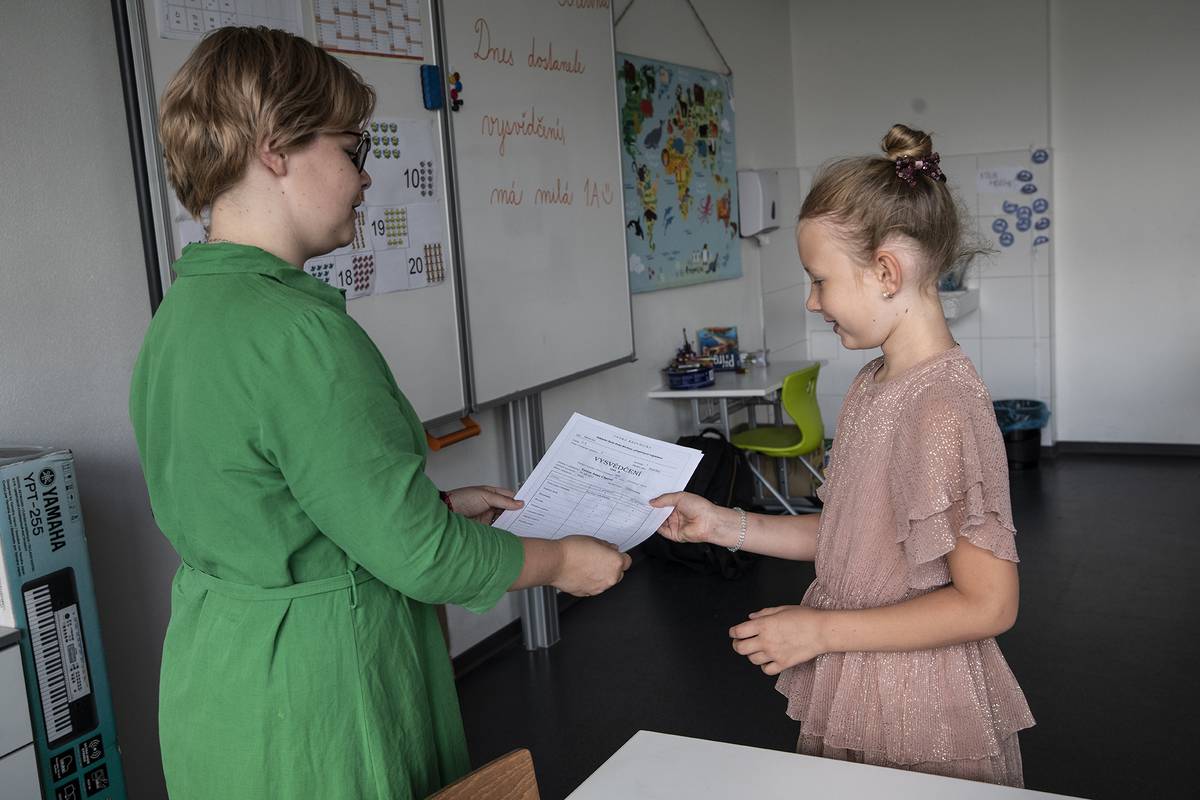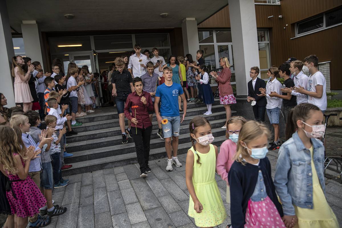 SZ / Prvňáčci ze Základní školy v Dolních Břežanech dnes dostali vysvědčení. Vyprovodili i loučící se deváťáky.
