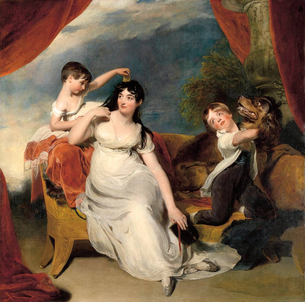 Maria Mathilda Binghamová se dvěma svými dětmi. Thomas Lawrence, asi 1810-18, olej na plátně. Na levé straně plátna byl dříve zobrazen i její manžel a otec dětí Henry Baring, ale po rozvodu byl odstraněn.