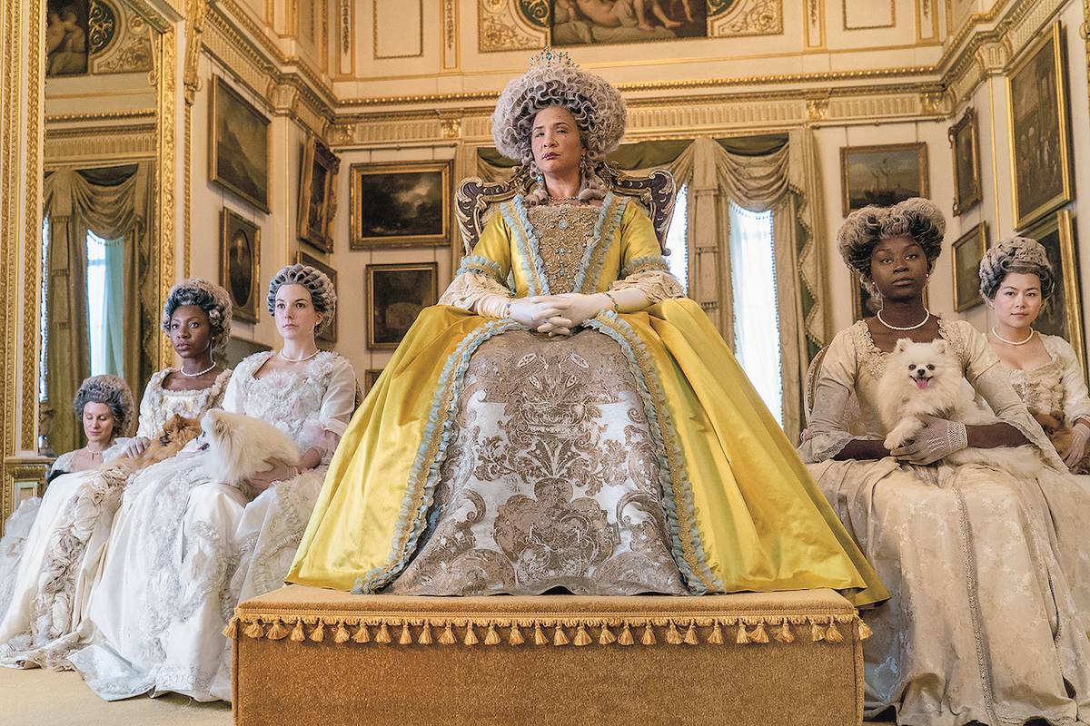 Královský dvůr v seriálu Bridgertonovi. Královnu Šarlotu hraje britská divadelní a televizní herečka Golda Rosheuvelová, narozená v Guyaně.