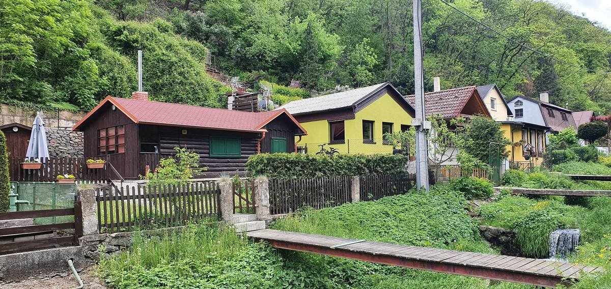 Při pozorném prohlédnutí této fotografie můžete skryté v zeleni odhalit čtyři naprosto rozdílné chaty. Rozdílné velikostí i použitým stavebním materiálem. Těsnají se ve stráni u Dolních Břežan jižně od Prahy nad železniční tratí Posázavského pacifiku, v lokalitě navštěvované hojně výletníky již na počátku 20. století a "osídlené trampy" v meziválečném období.