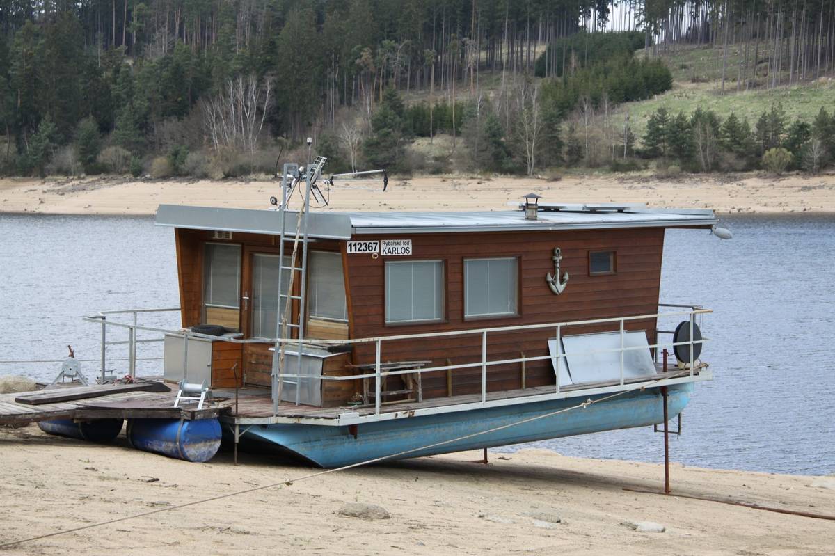 Hladina Orlické přehrady je z jara vždy nižší. V tomto konkrétním případě více, než je obvyklé - z důvodu výstavby lodního výtahu. A tak rekreační hausbóty čekají na "příliv", aby mohly v letní sezoně brázdit hladinu přehrady či zakotvit v nějaké zátoce.