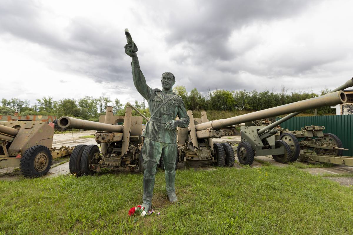 Kanony vzor 37 ráže 122 mm. Před nimi voják, jemuž lidová tvořivost vymyslela přezdívku Ivan Diviš (stával na rokycanském náměstí a „divil se“, kde se vzal v Rokycanech, které osvobodili Američané).