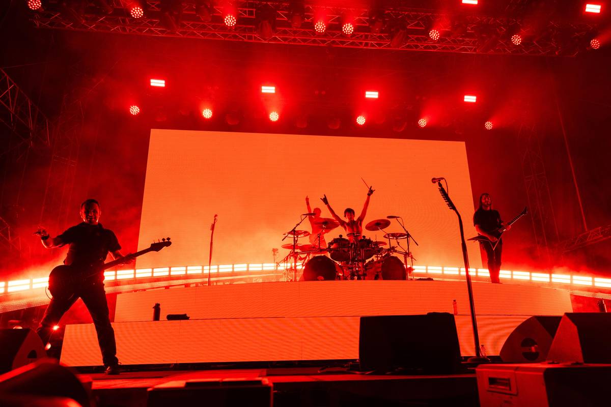 Hraje se na pěti pódiích. Na fotografii je vystoupení amerických Mastodon, kteří připomněli minulý měsíc zesnulého Ozzyho Osbourna. Jeho obří portrét zasvítil na pódiu.