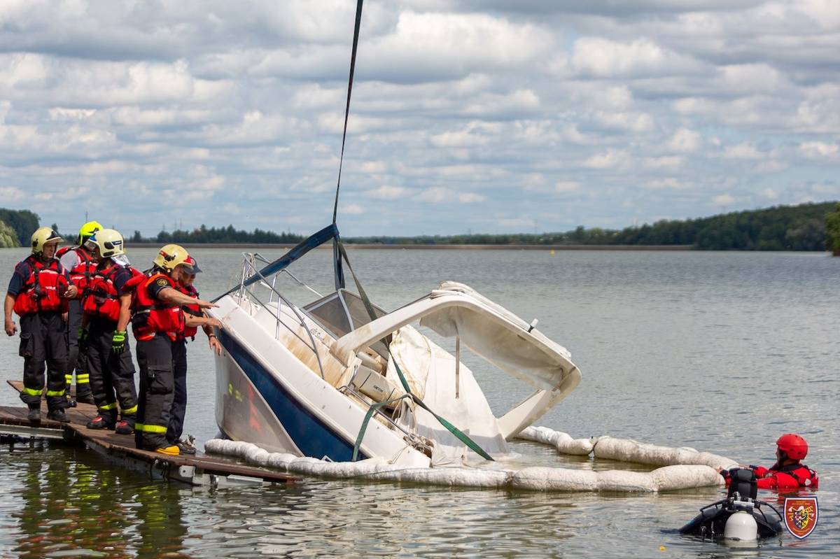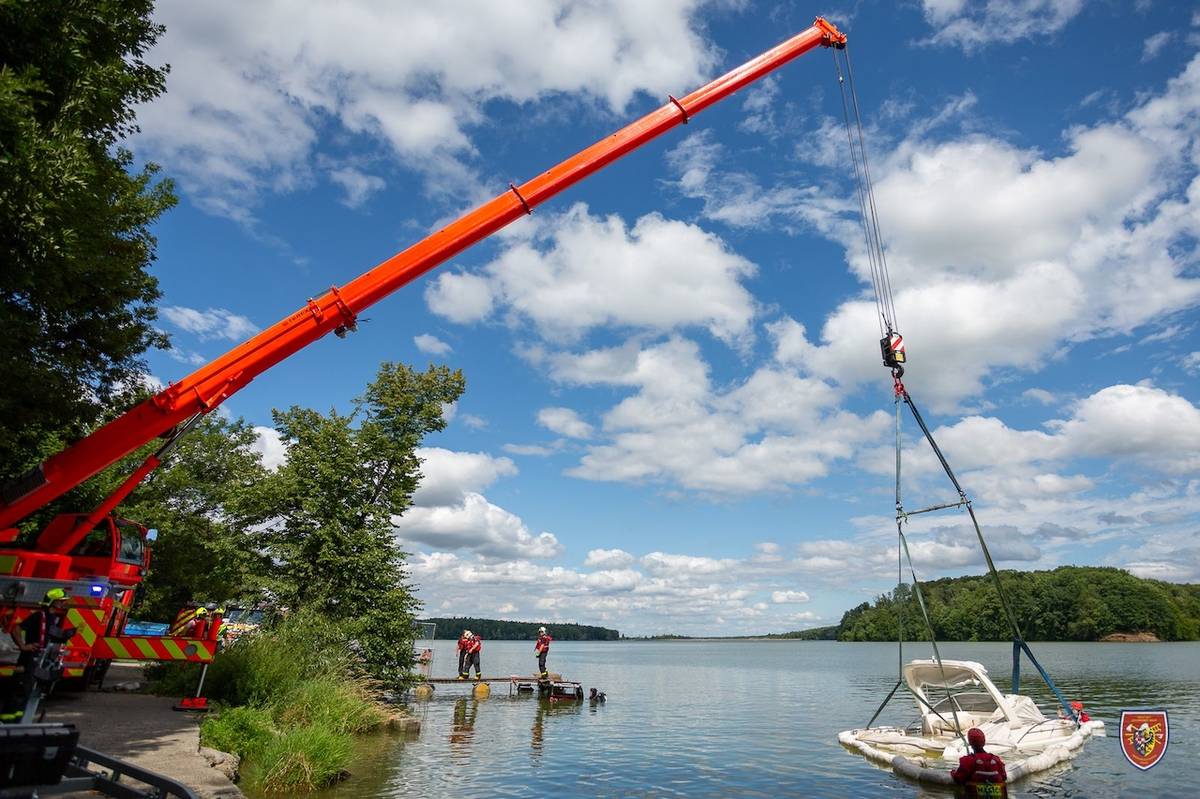 Loď hasiči na břeh vytáhli automobilovým jeřábem.