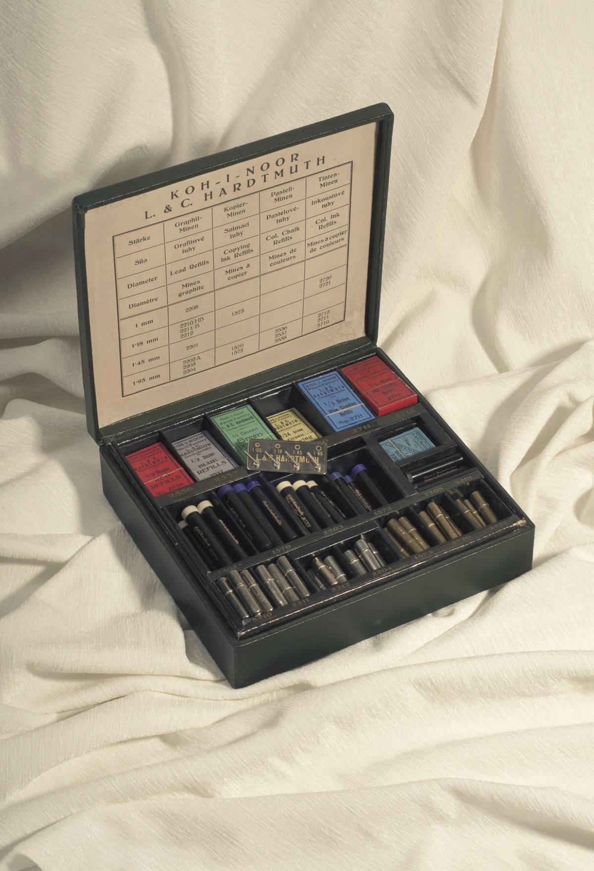 Koh-i-noor Hardtmuth, tužky. Historická kazeta s klasickou grafitovou tužkou 1500. Historická kazeta s grafitovými tužkami se speciálním systémem otevírání (1920).