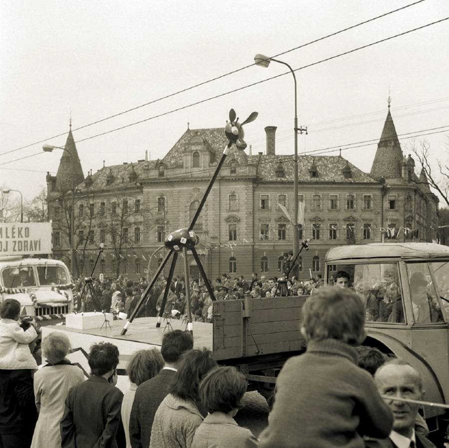 Koh-i-noor, tužky. Alegorický vůz závodu KOH-I-NOOR při oslavách 1. máje, v pozadí justiční palác (České Budějovice, rok 1967)